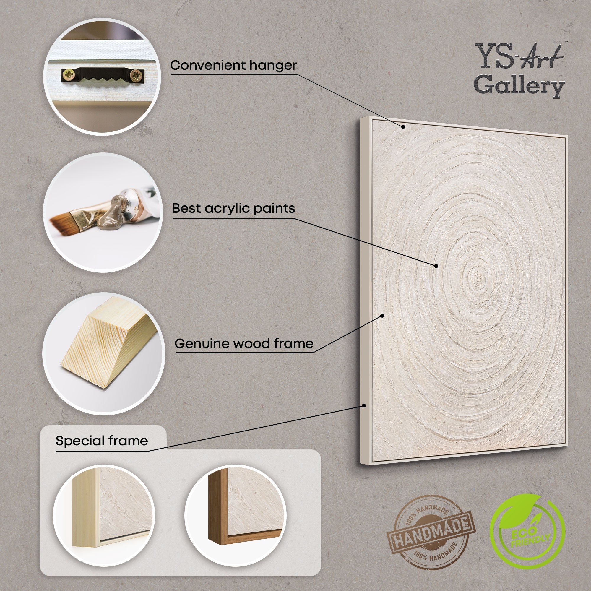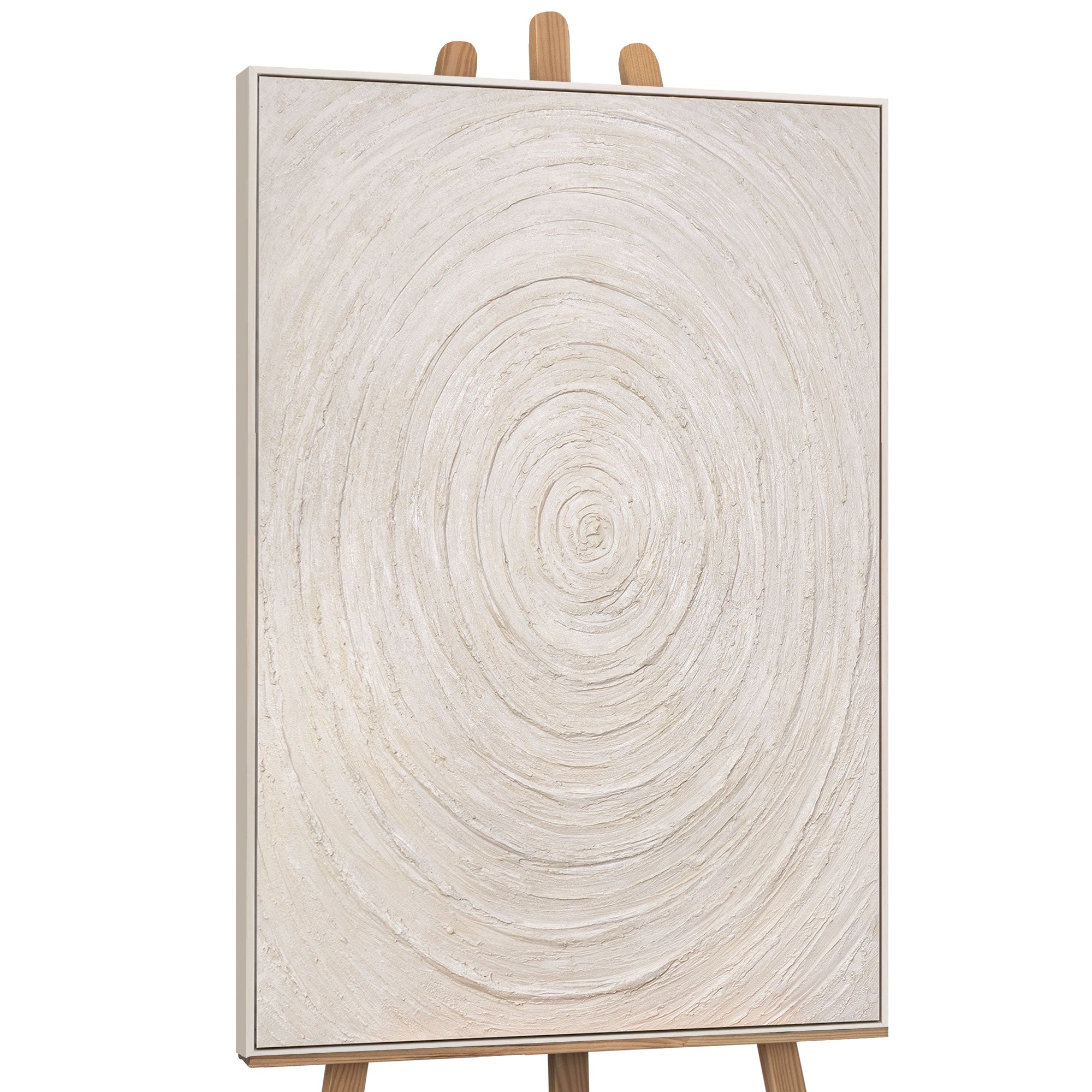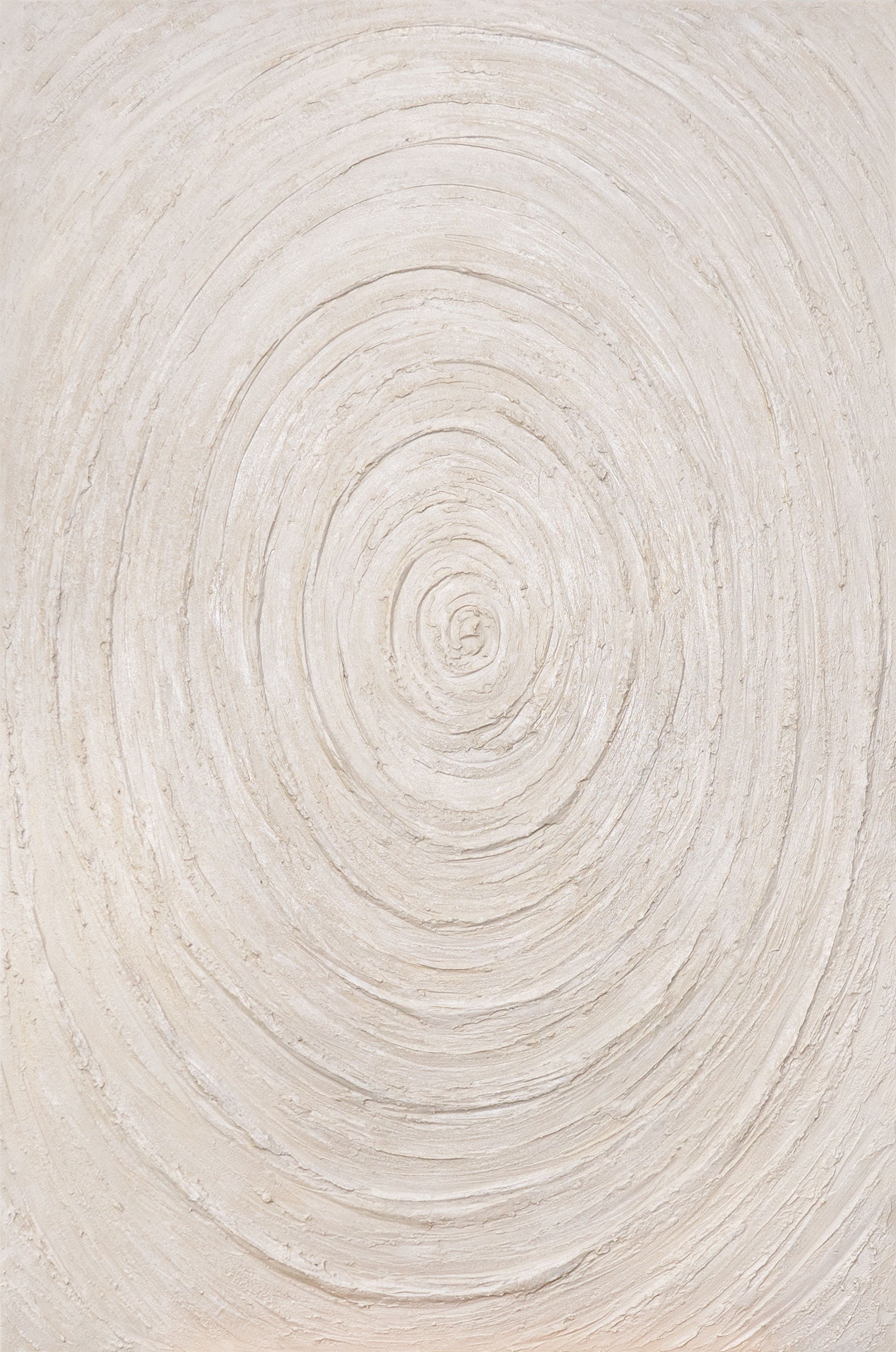 Bring harmoni og ro ind i dit hjem med dette håndlavede abstrakte vægmaleri. De koncentriske cirkler i bløde beige- og naturtoner minder om bølger eller årringe og tilfører værket symbolsk dybde og en meditativ kraft.