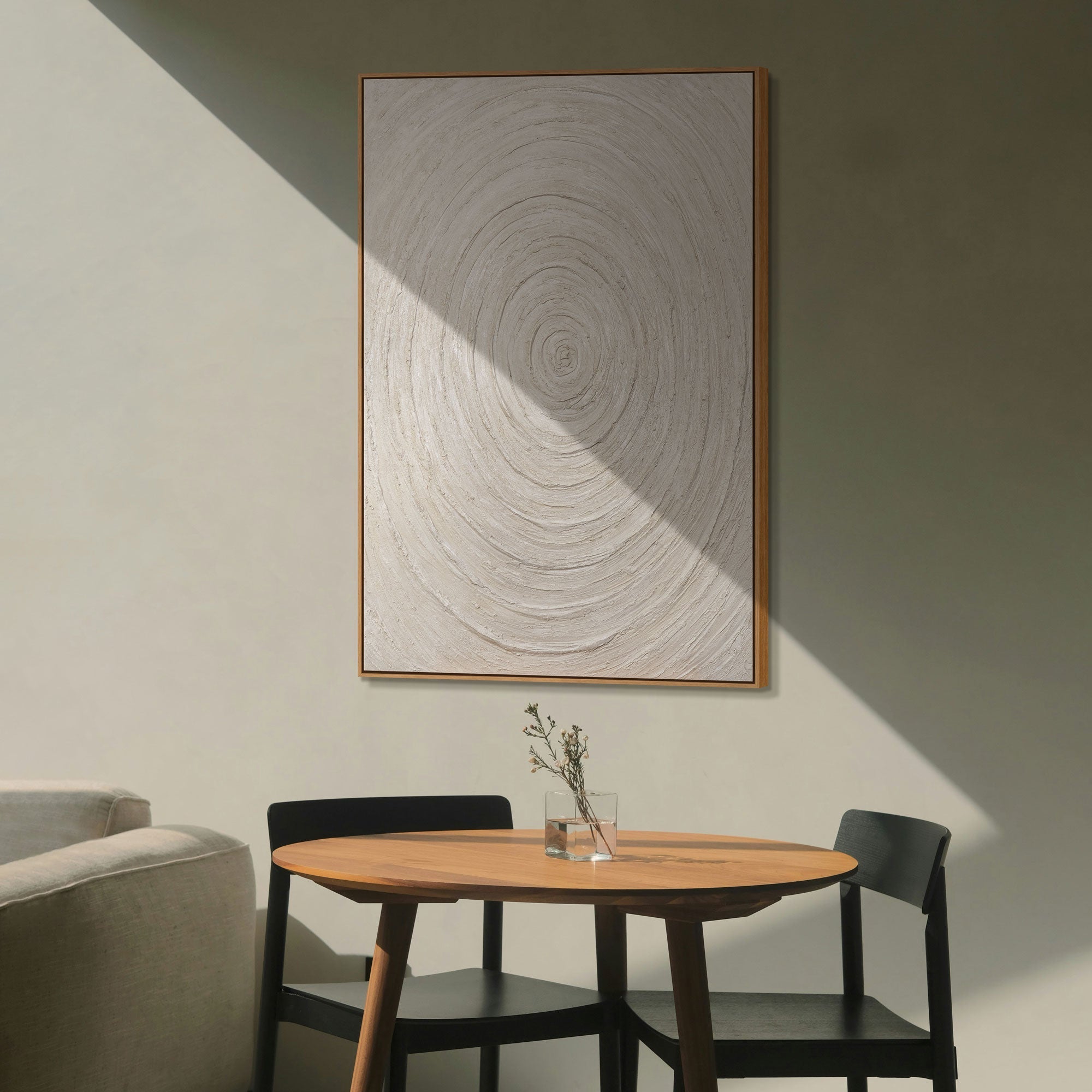 Dette moderne strukturmaleri passer perfekt til minimalistiske, skandinaviske og nutidige boligstile. Det skaber en elegant og rolig atmosfære i stue, soveværelse eller kontor og bliver et tidløst blikfang på væggen.
