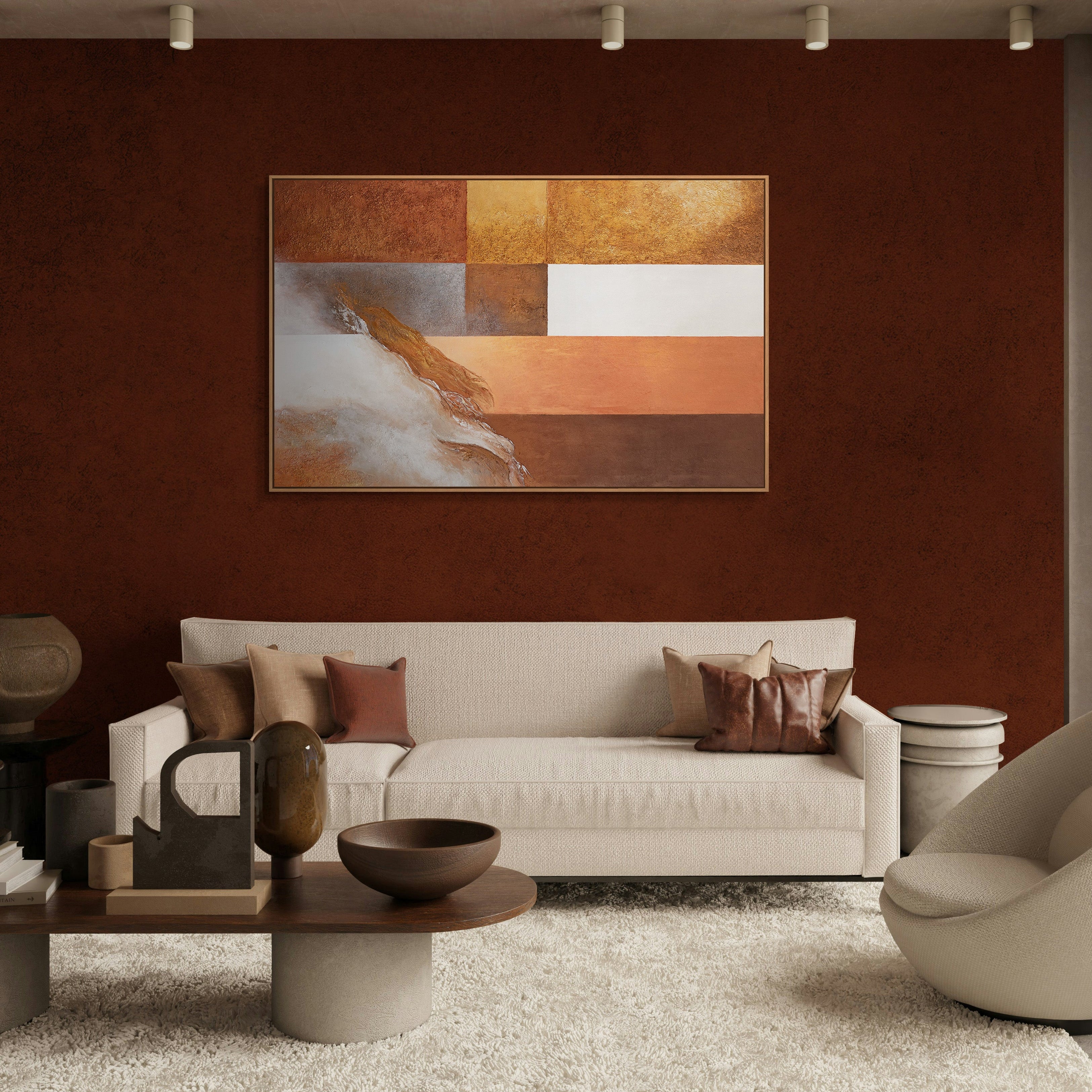 Das handgemalte Leinwandbild wird im Rahmen präsentiert und eignet sich ideal als moderne Wanddekoration für Wohnzimmer, Essbereich oder stilvolle Arbeitsräume. Die ausgewogene Farb- und Formensprache sorgt für Ordnung, Ruhe und visuelle Klarheit im Raum.