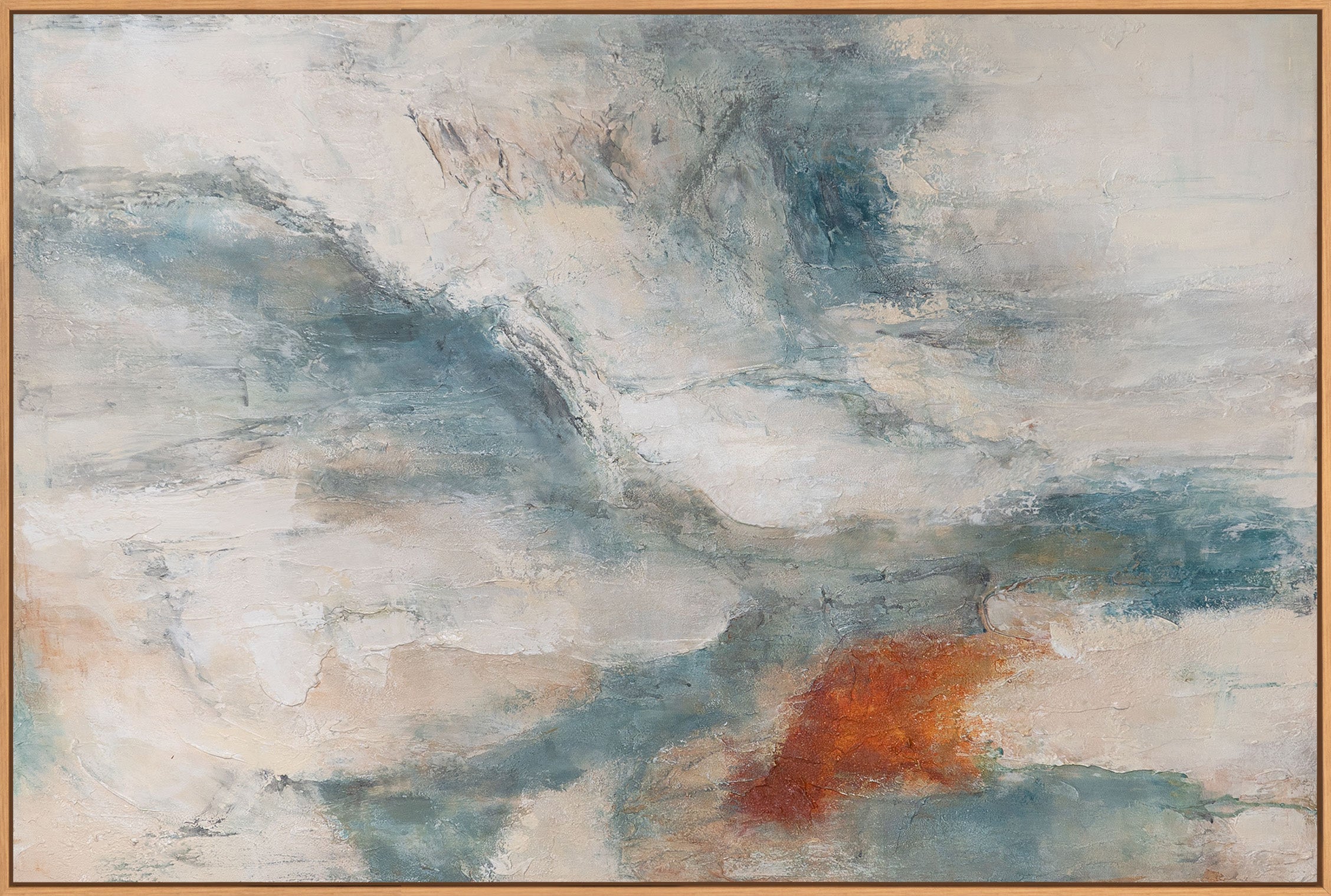Das handgemalte Leinwandbild wird in einem Rahmen in Holzoptik präsentiert und eignet sich ideal als moderne Wanddekoration für Wohnzimmer, Schlafzimmer oder Büro. Die ausgewogene Farbkomposition fügt sich harmonisch in helle, natürliche und moderne Wohnkonzepte ein.