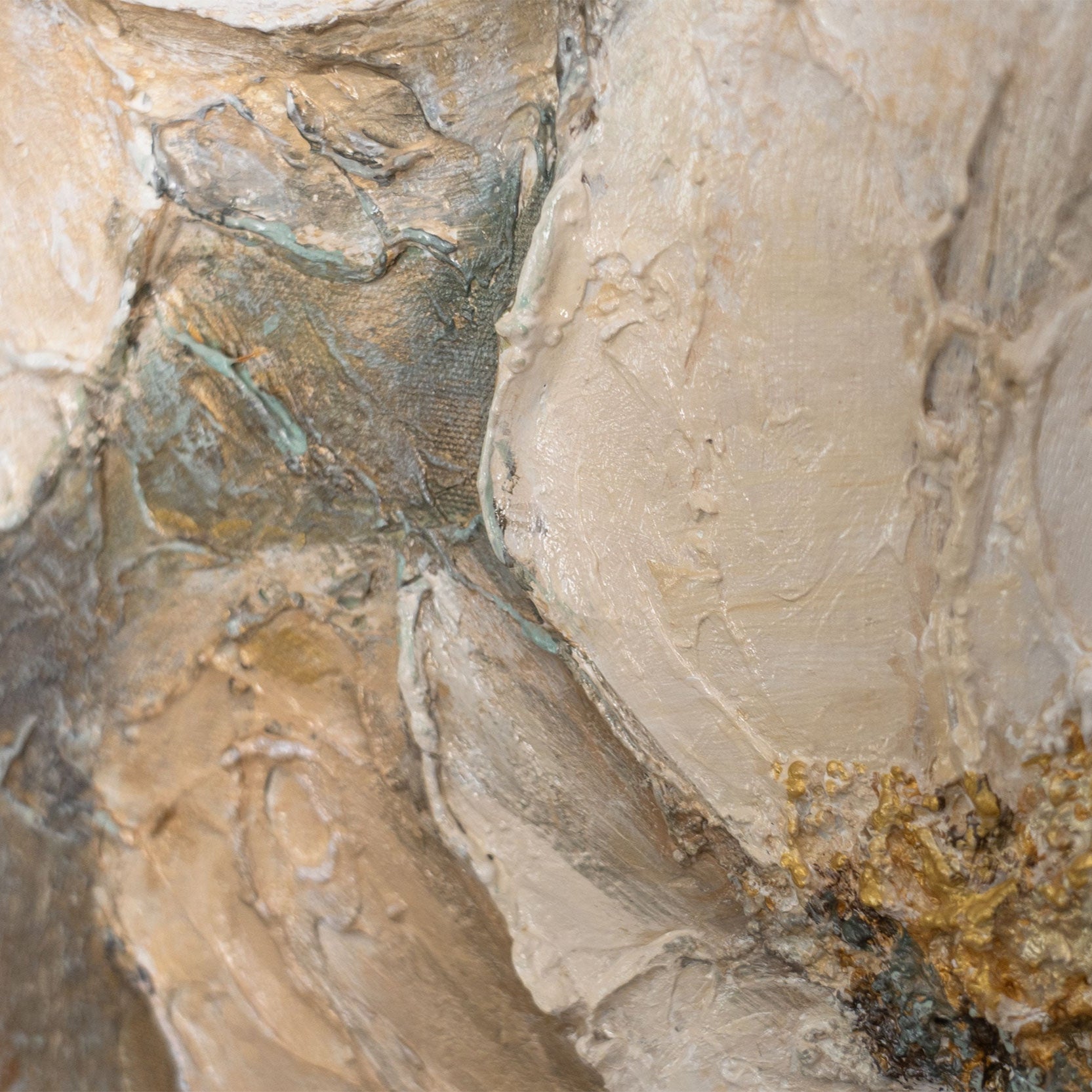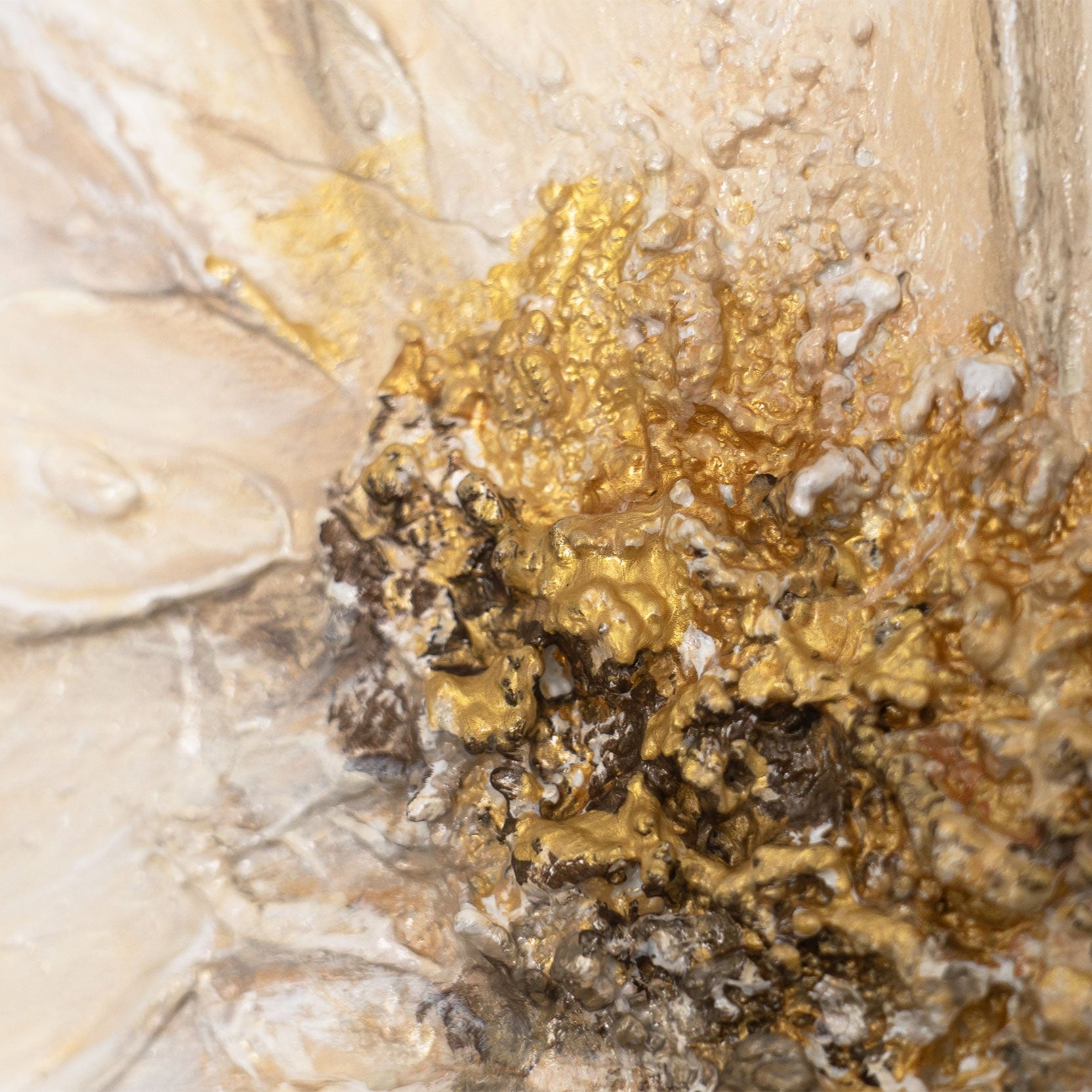 "Sløret af Ømhed" er et håndmalet acrylmaleri, der imponerer med sarte hvide blomster på en varm beige baggrund. Kronbladene fremstår særligt levende gennem den reliefagtige struktur og får en ædel dybde. Bløde farveovergange mellem creme, beige og diskrete guldnuancer giver værket et harmonisk og roligt udtryk.