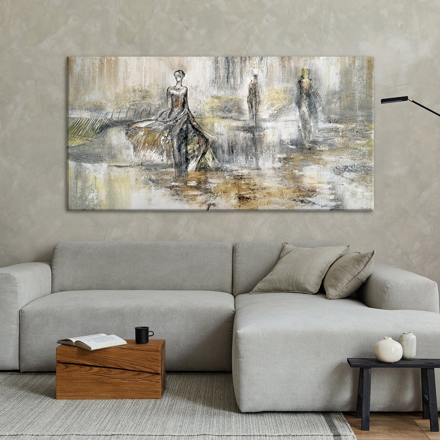 Gåde, charme og ømhed – sådan kan dette maleri på lærred kort beskrives. Hver person ser sin egen historie – nogen en mystisk fremmed, nogen øjeblikket fra et modeshow. Det er det, der gør maleriet fantastisk. Det sætter tonen for dit interiør og fremhæver din personlighed.