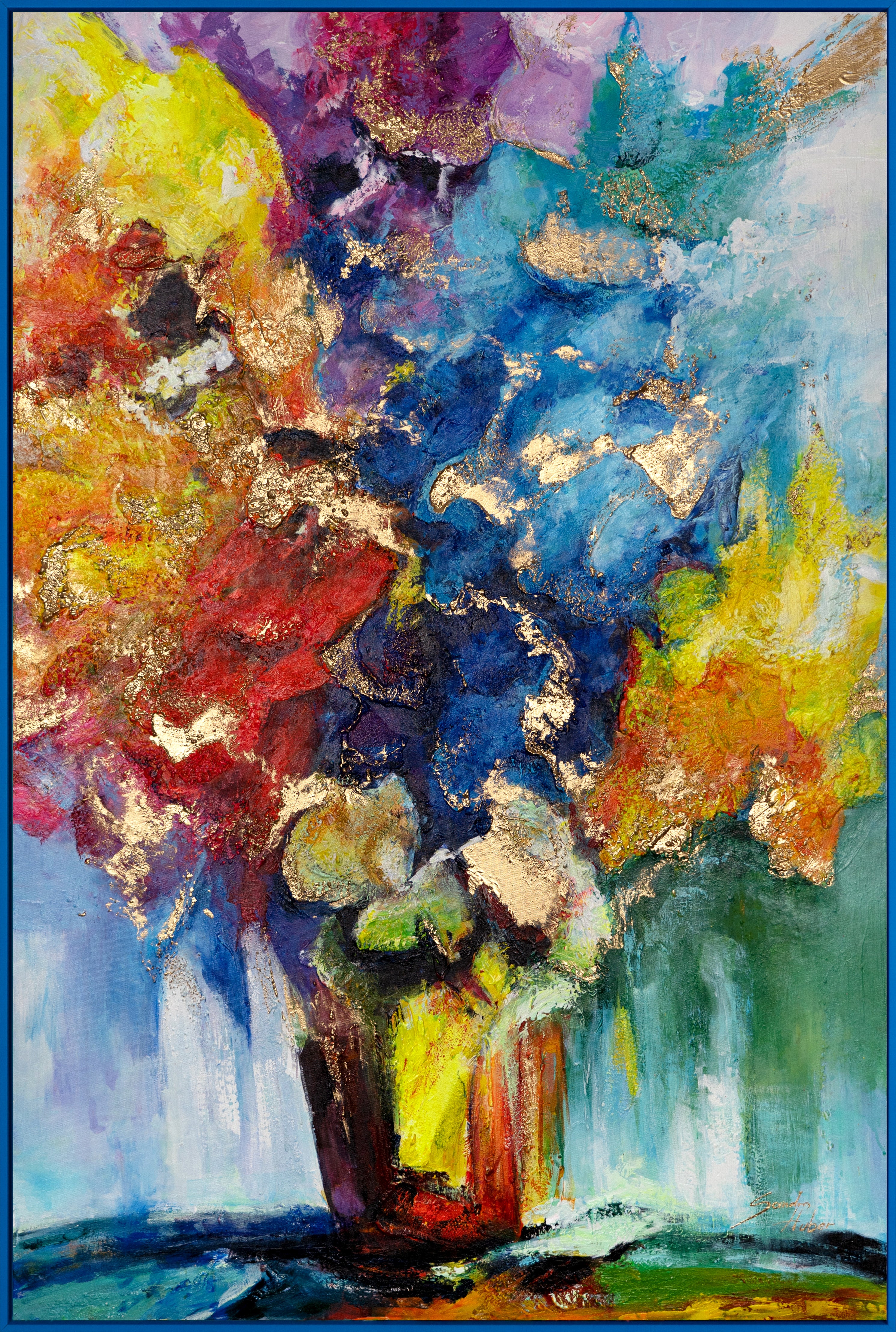 Berig dit hjem med dette farverige, abstrakte kunstværk, som skildrer naturens skønhed i levende nuancer. Værket imponerer med intense farvetoner og udtryksfulde penselstrøg. Det er 100 % håndmalet og fremhævet af en moderne guldramme.