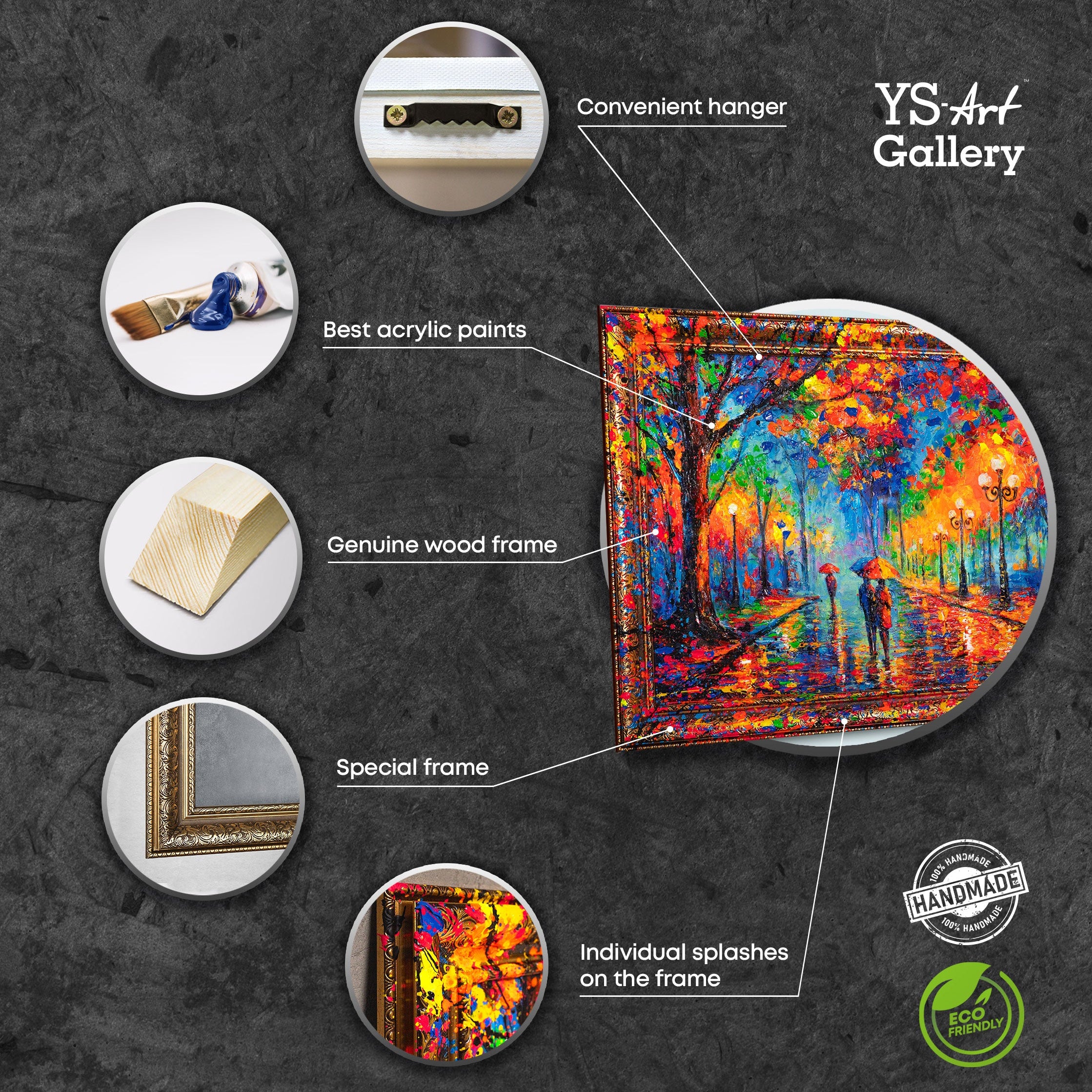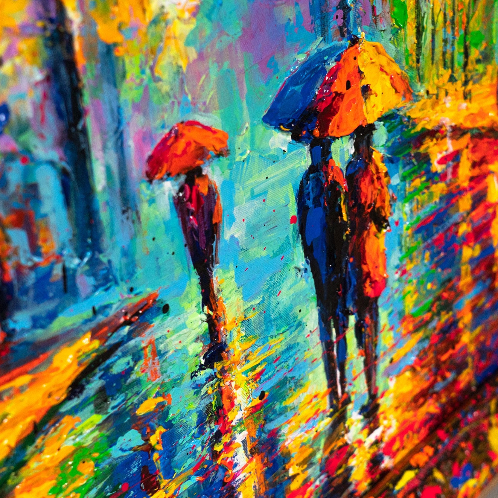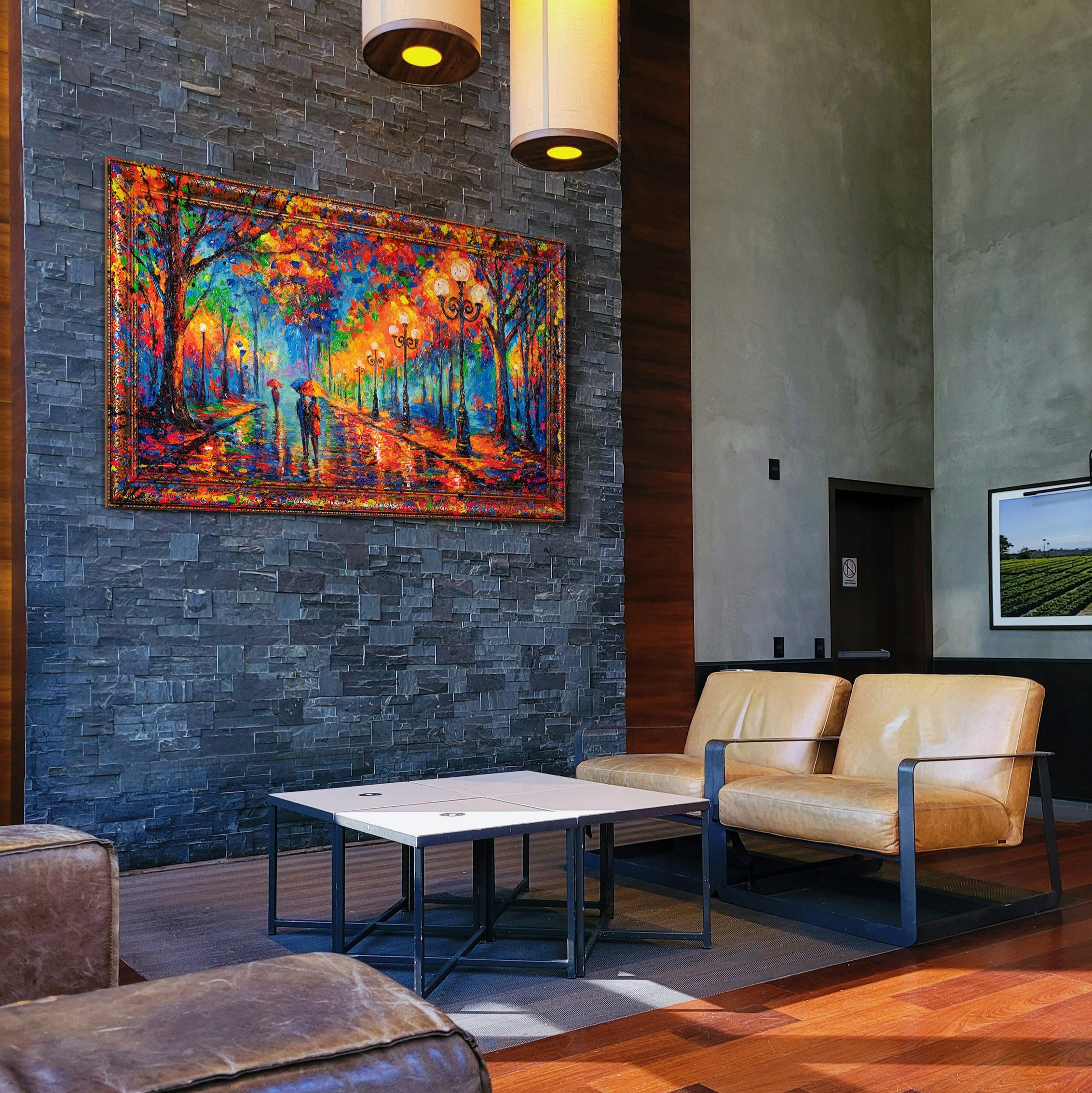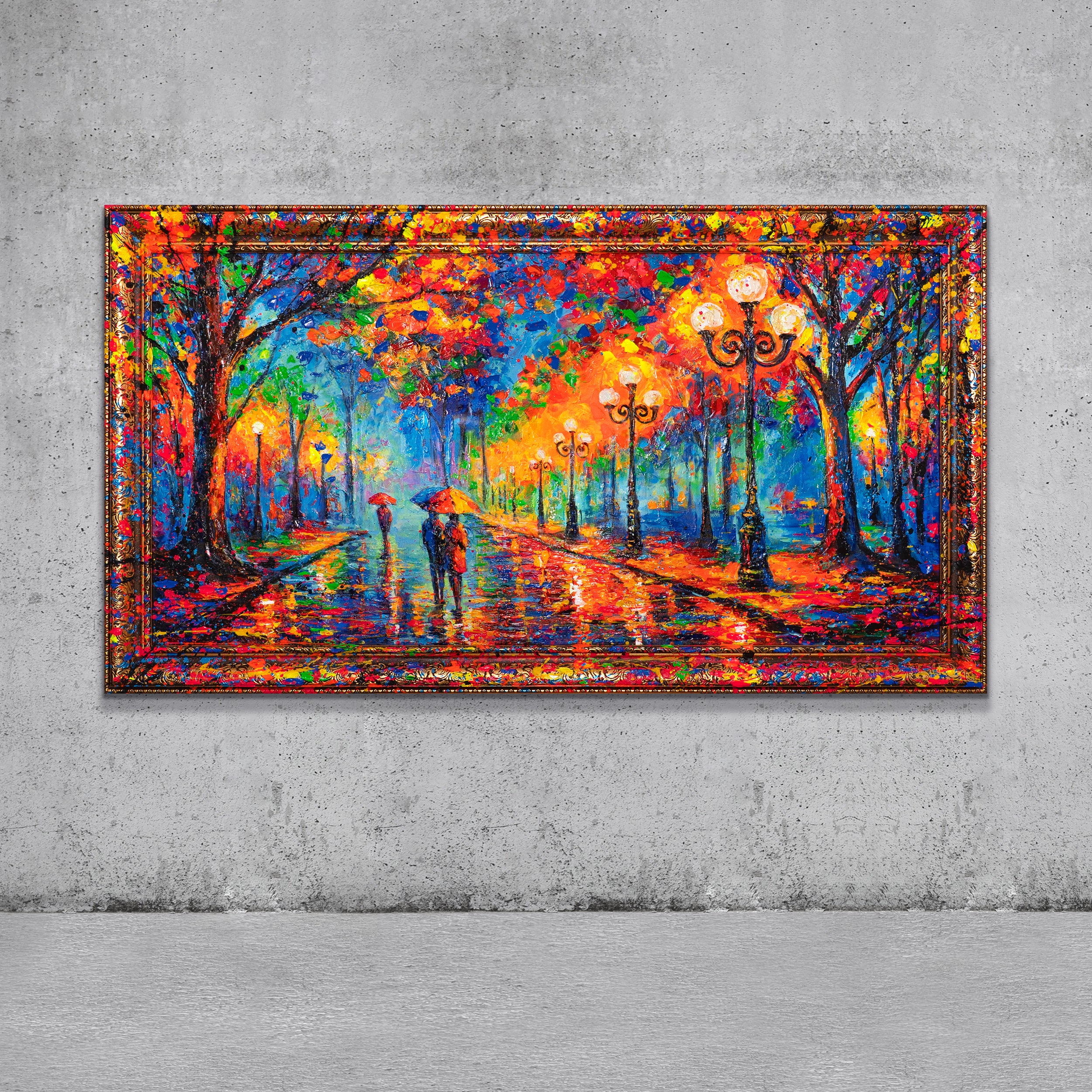 Dette billede „Aftentur“ fanger stemningen i farver: En romantisk spadseretur under farverige træer, hvor lampernes lys spejler sig i det våde fortov og skaber en varm, levende atmosfære. Med kraftfulde penselstrøg og klare farver bliver hvert element til et kunstværk, der vækker følelser og tilfører moderne elegance til dit hjem.