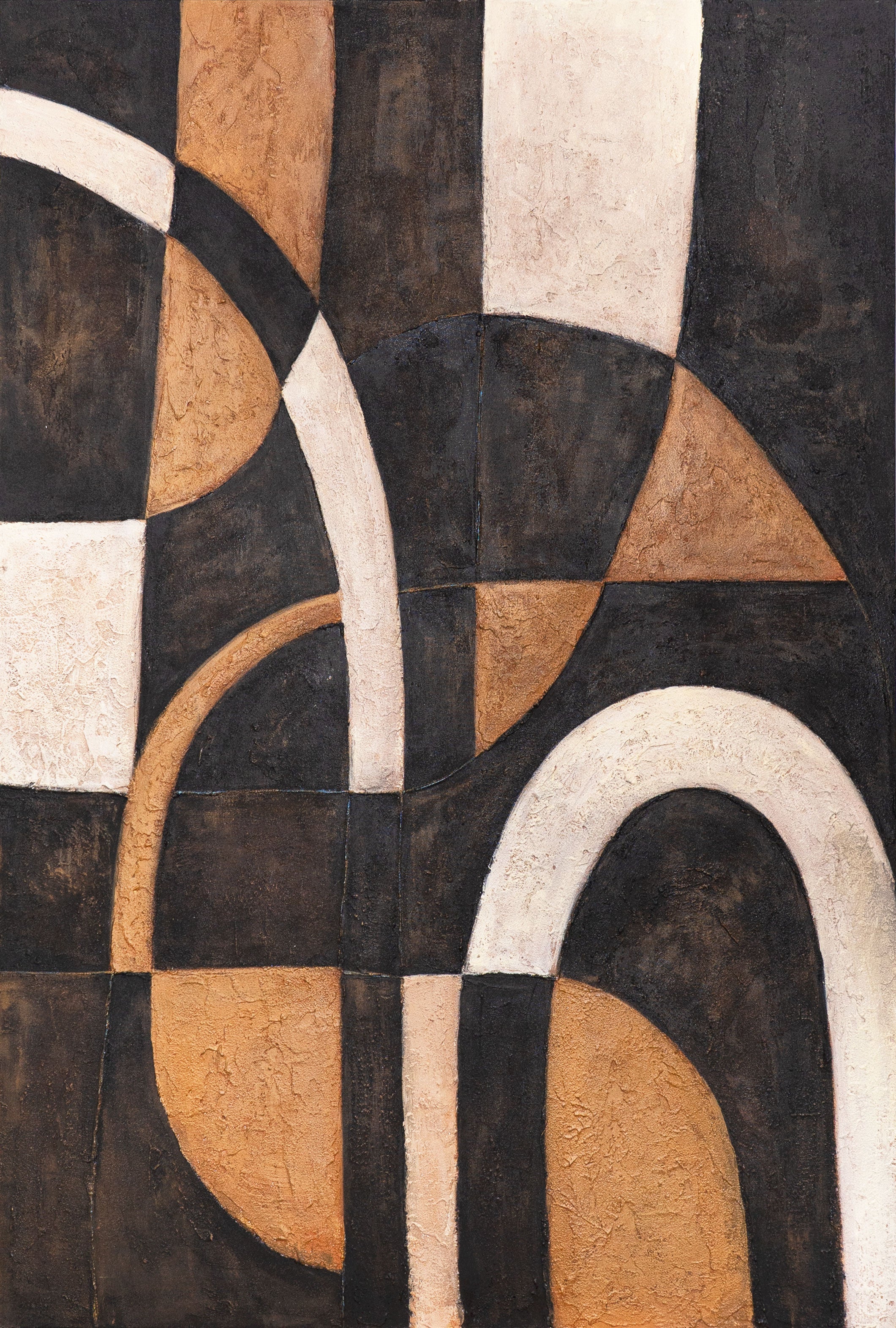 Dette håndmalede akrylmaleri fascinerer med sit spil af bløde kurver og geometriske flader. Kombinationen af varm brun, elegant beige og dyb sort skaber et harmonisk samspil af kontraster. Den reliefagtige struktur giver maleriet dybde og karakter, hvilket gør det til et ægte blikfang.