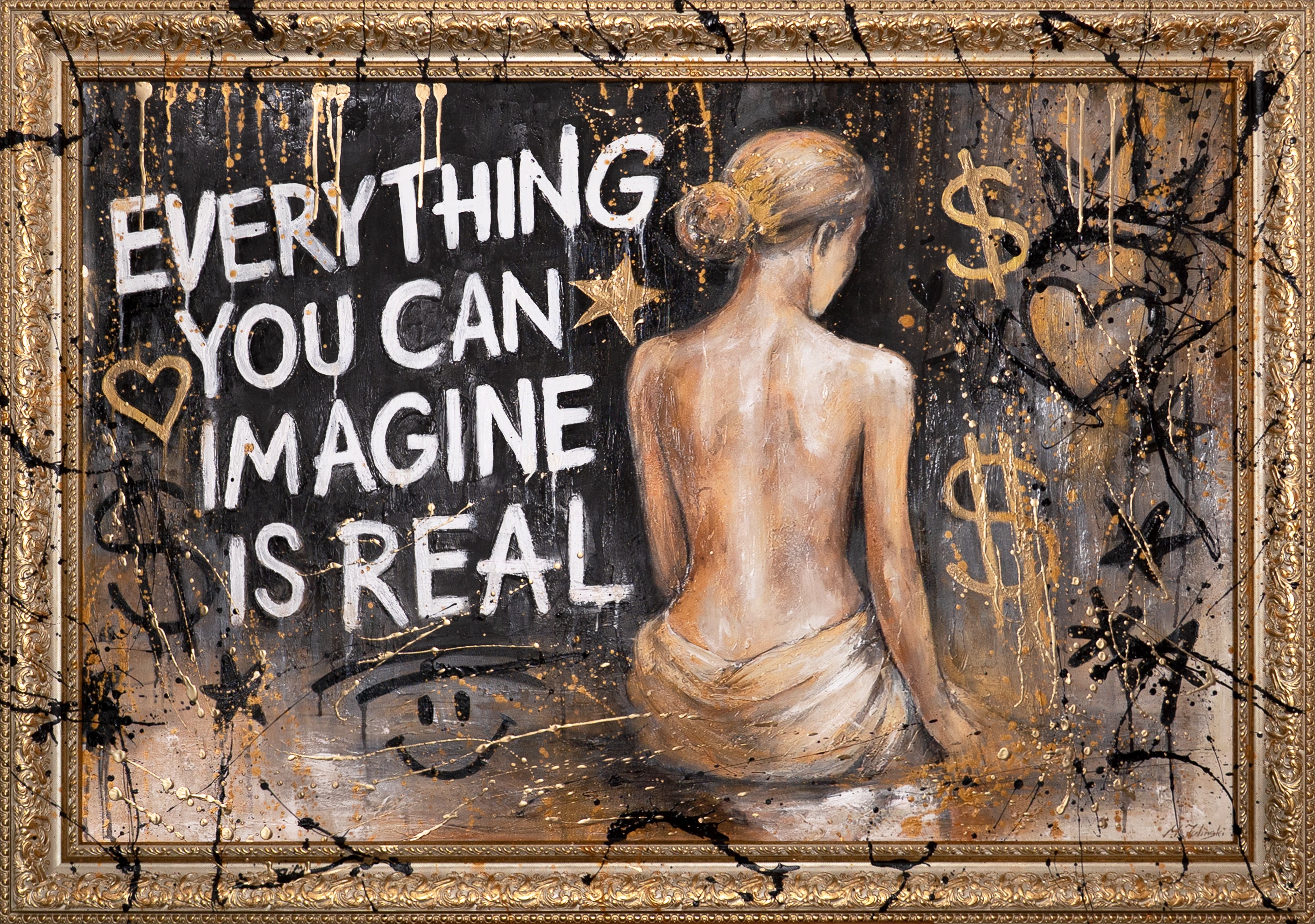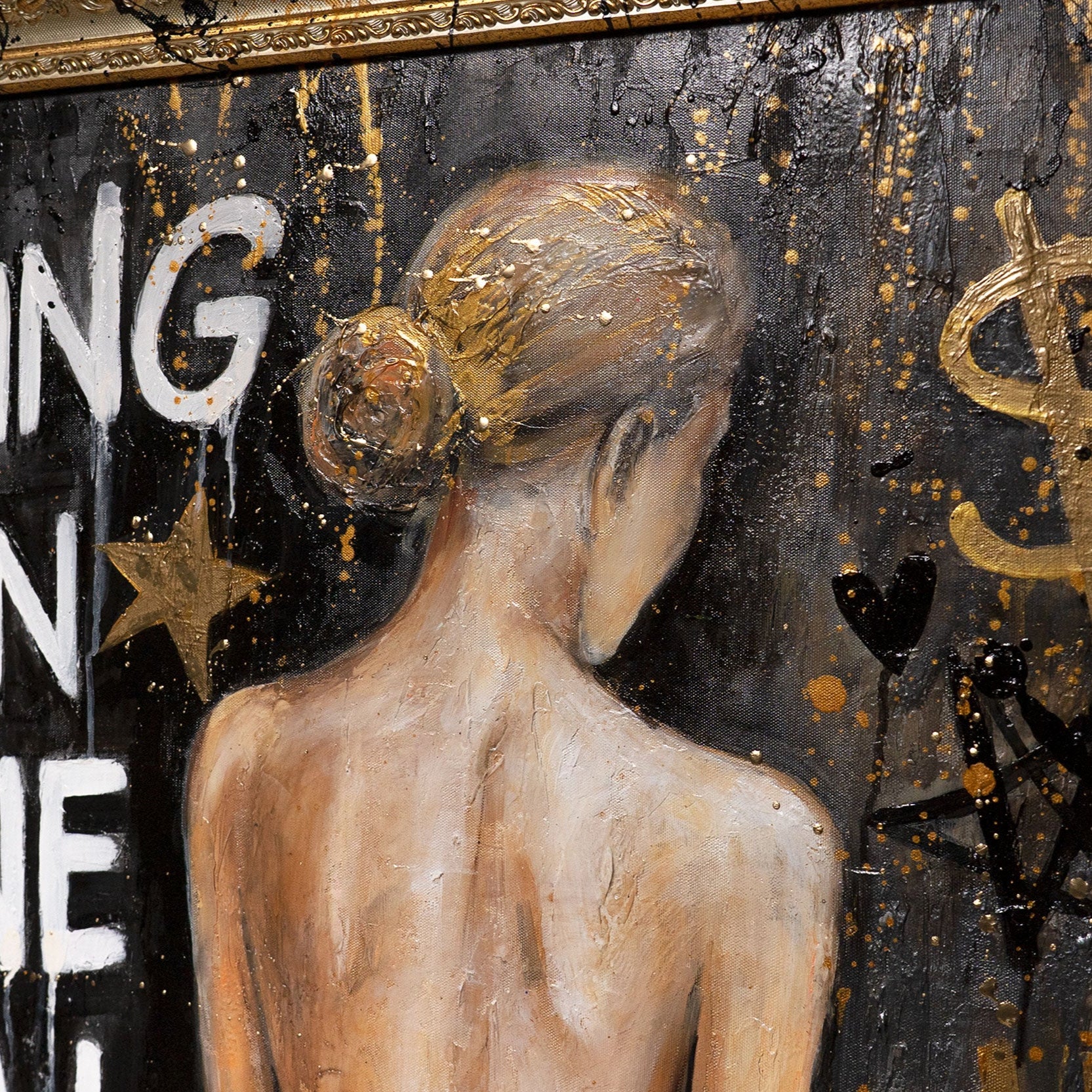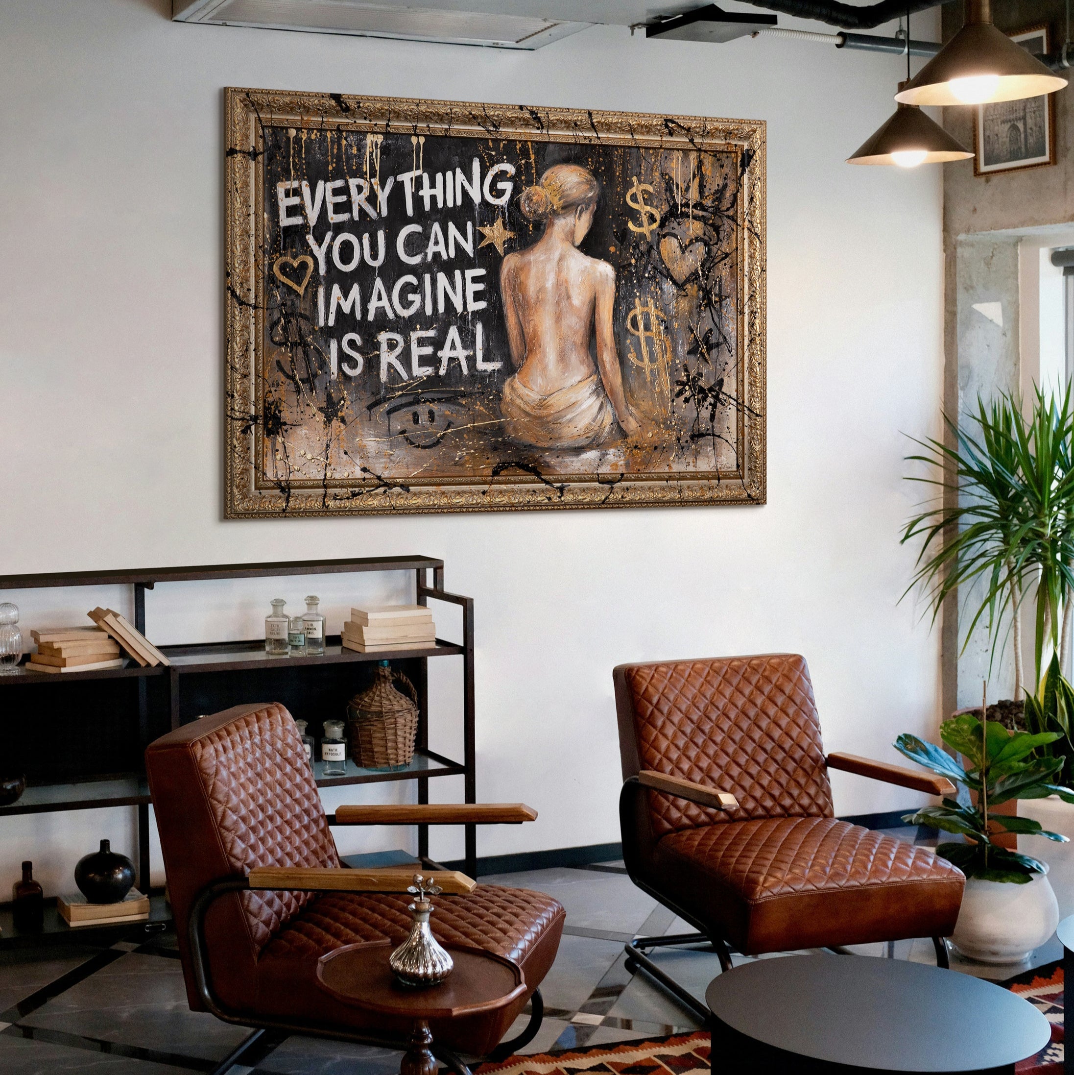 Dette maleri „Alt er muligt“ er mere end blot dekoration – det er et statement. Inspireret af moderne street art og klassisk maleri kombinerer det kalligrafi med figurative elementer. De varme gyldne nuancer og kontrastfulde sort-hvide detaljer gør det til et ægte blikfang i ethvert hjem.