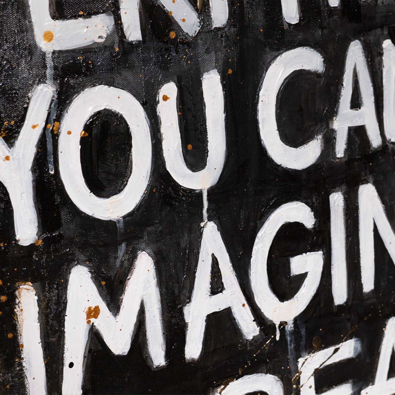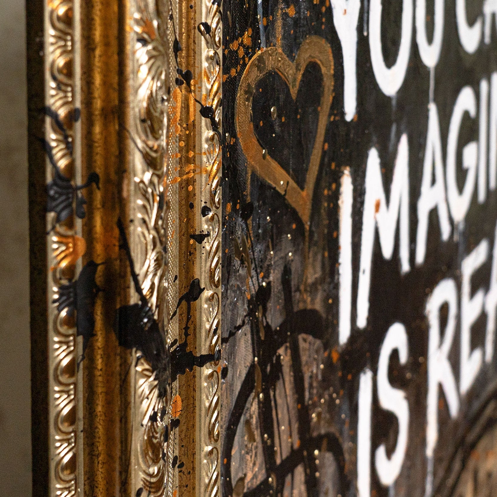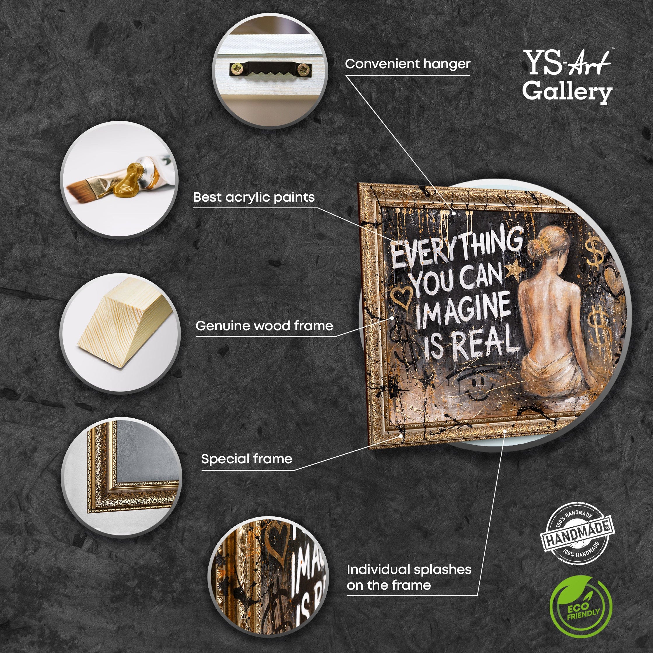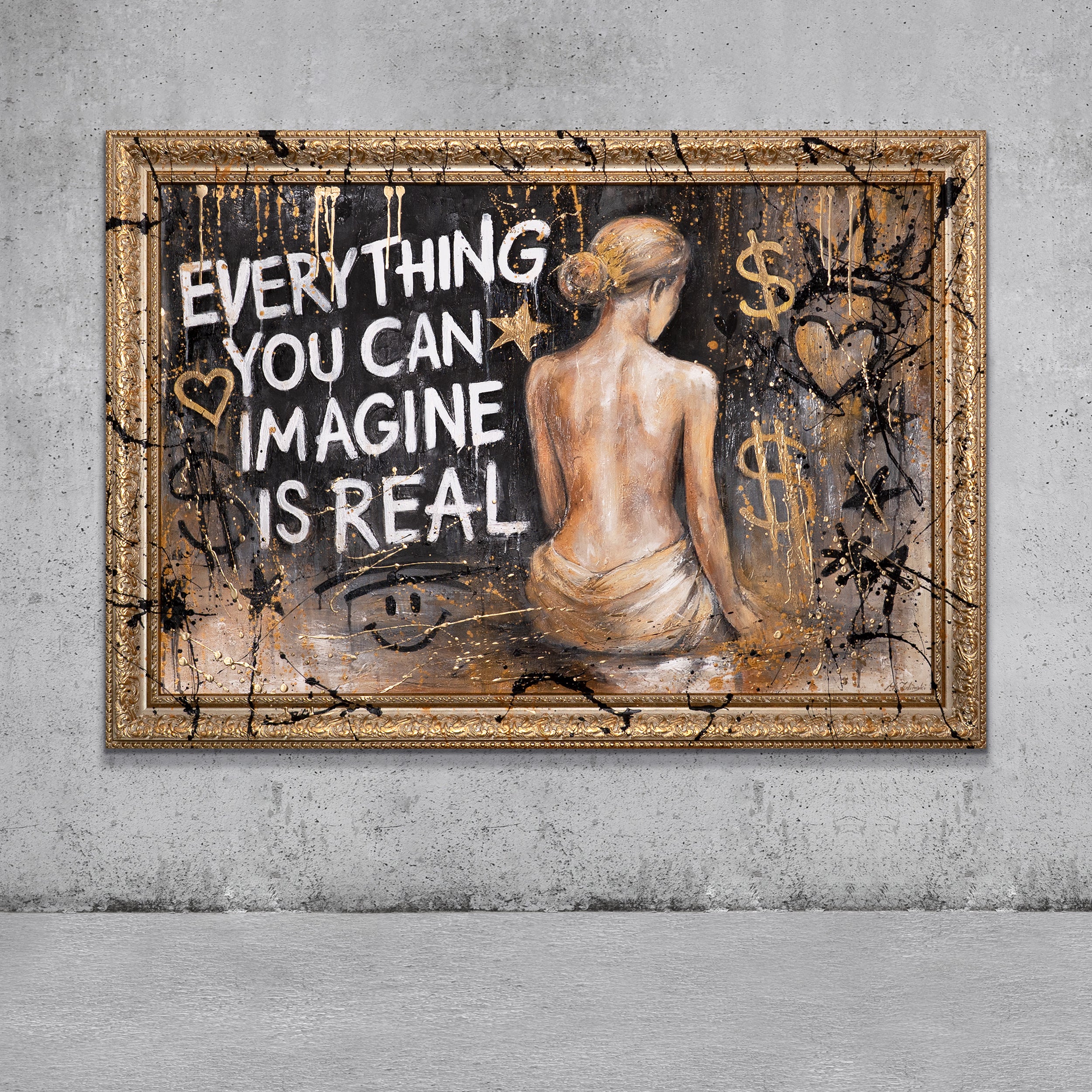 Dette maleri „Alt er muligt“ er mere end blot dekoration – det er et statement. Inspireret af moderne street art og klassisk maleri kombinerer det kalligrafi med figurative elementer. De varme gyldne nuancer og kontrastfulde sort-hvide detaljer gør det til et ægte blikfang i ethvert hjem.