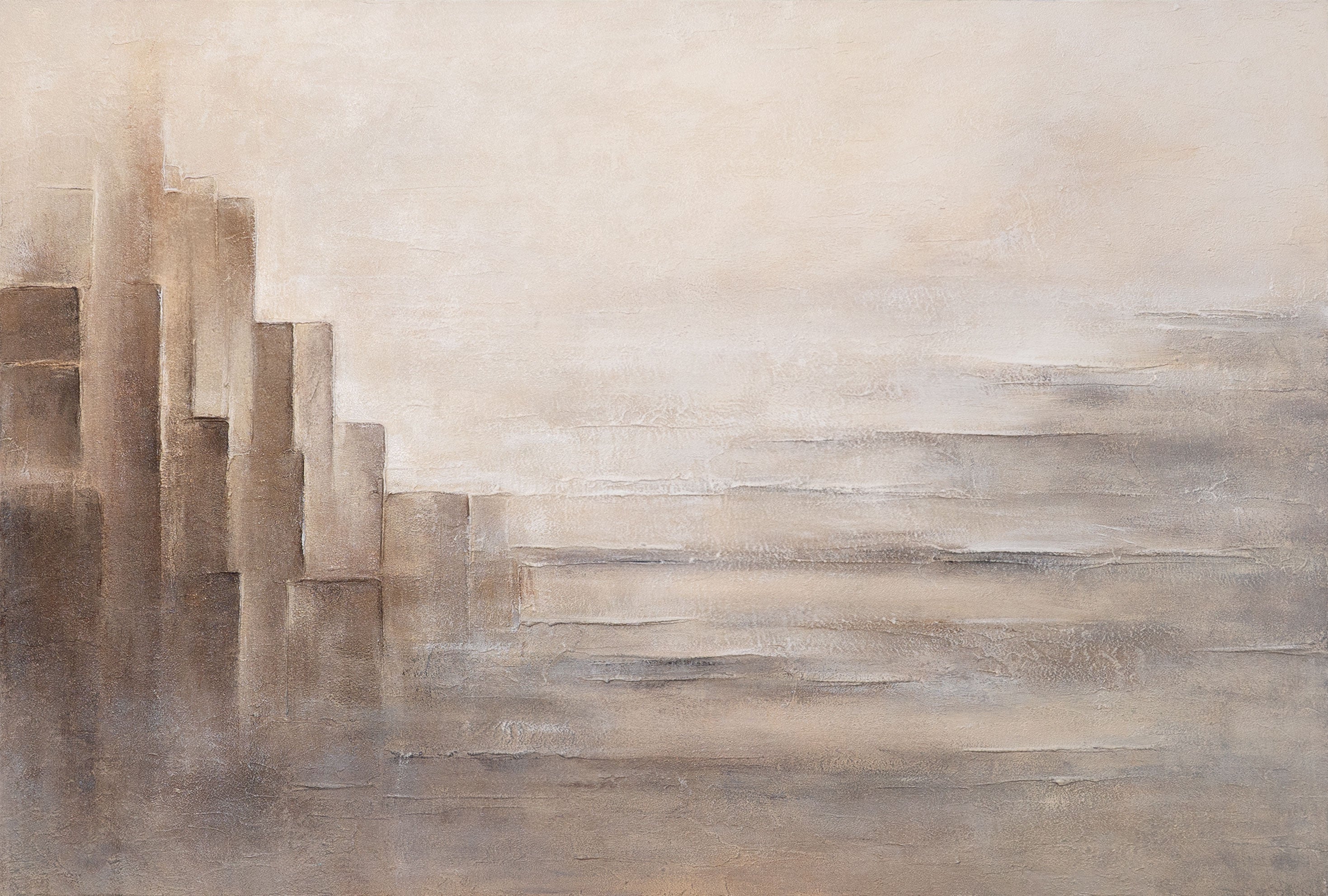 Det håndmalede lærredsmaleri "Grænser for Illusion" leger med klare strukturer og bløde overgange. Rektangulære former rejser sig som trin, mens bløde beige- og brune nuancer flyder ud i brede flader. Kompositionen giver indtryk af et urbant landskab, der forsvinder i det fjerne – en blanding af arkitektur og illusion.
