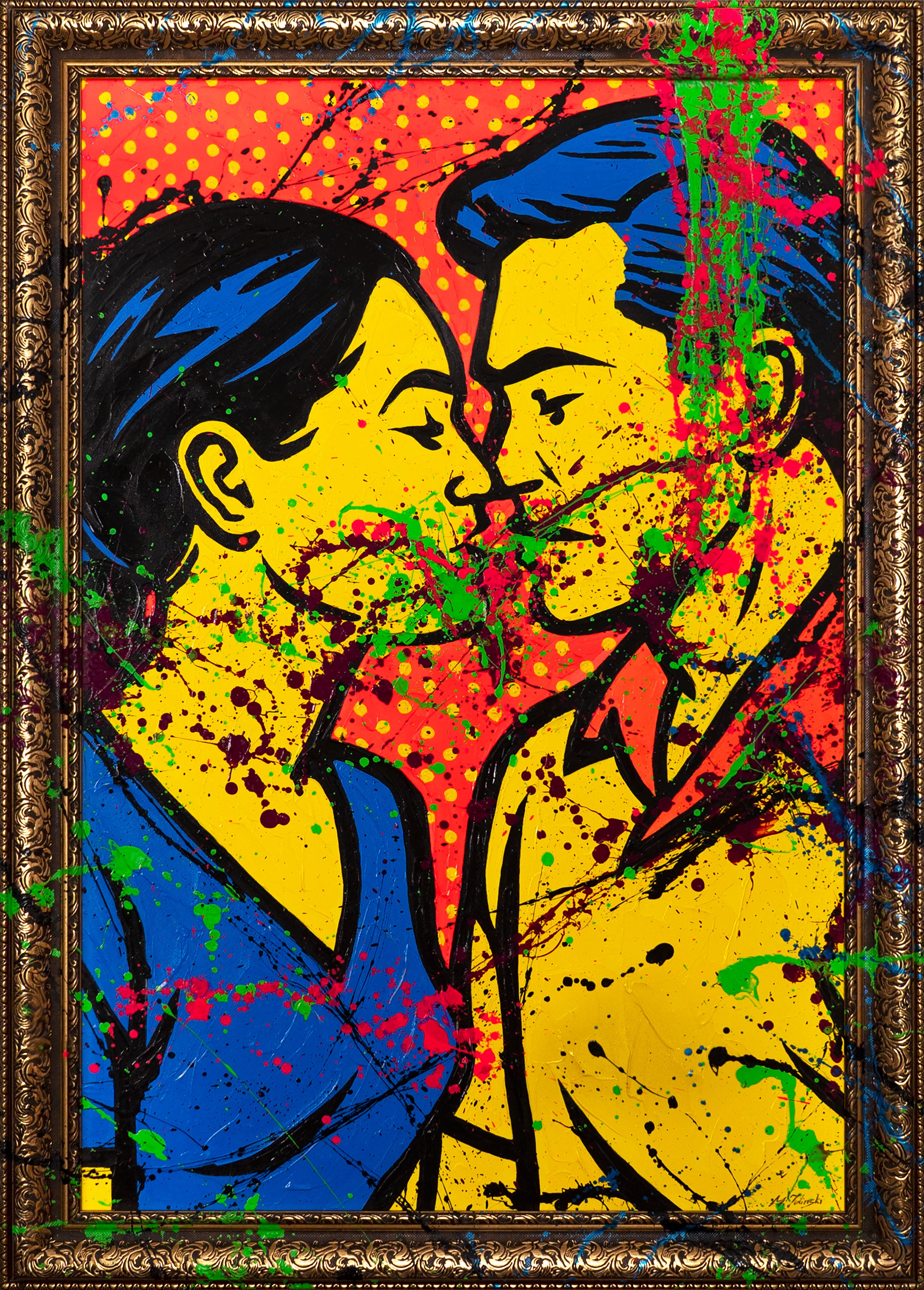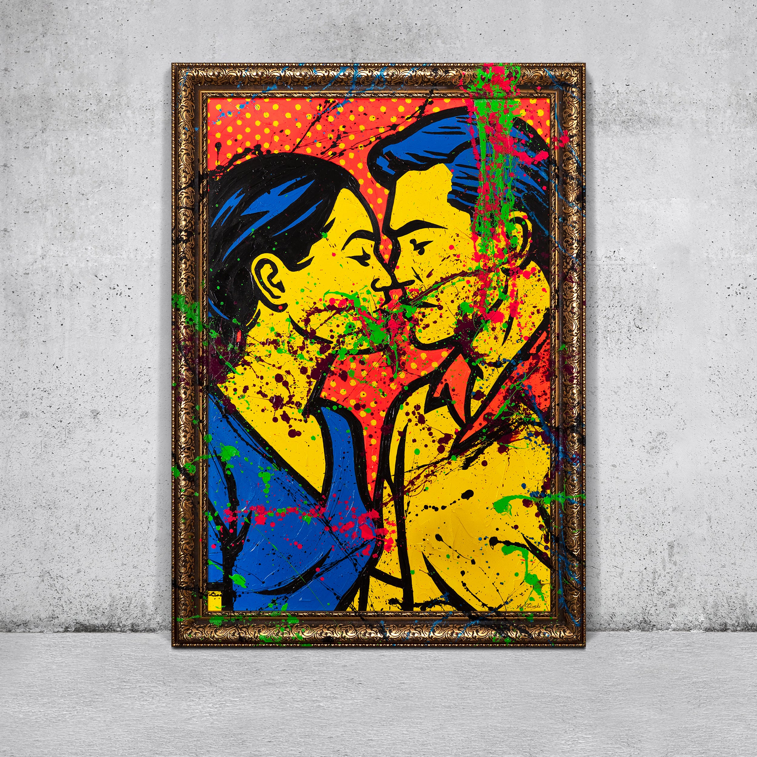 „Farverigt Kys“ viser et par i ikonisk Pop-Art stil – lysende gule ansigter, intense blå nuancer og en rød baggrund med prikker. Dynamiske farvesprøjt i grøn, pink og sort giver værket energi og urbanitet. Hvert penselstrøg er håndmalet og gør billedet til et unikt statement mellem romantik og street-art.