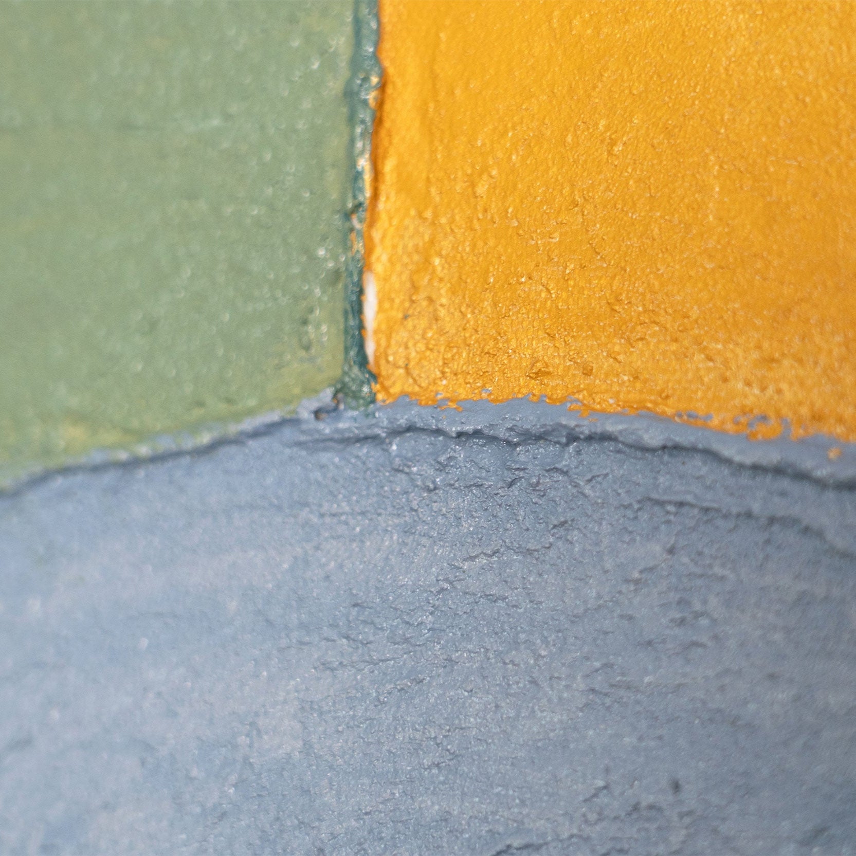 "Varm Geometri" er et håndmalet akrylmaleri, der imponerer med sin klare geometriske struktur og kraftfulde farveflader. Rektangler i orange, grøn, gul og brun indrammer en central cirkulær flade i blå. Den levende farvepalet og den pastose struktur giver værket et moderne og kunstnerisk udtryk.