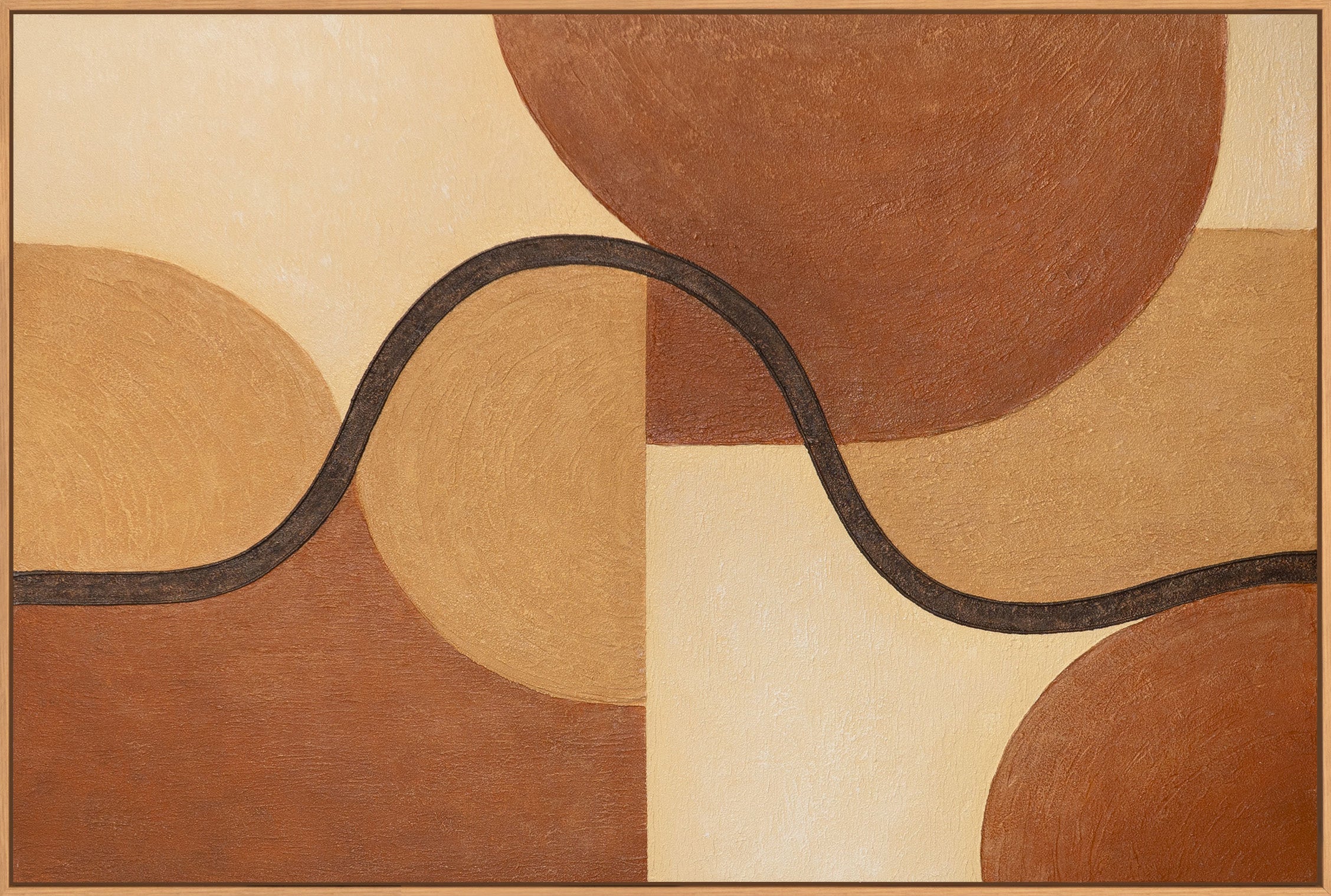 "Intertwining of Forms" er et abstrakt akrylmaleri med klare geometriske former og blidt flydende linjer. Varme beige, okker og brune toner blandes harmonisk og skaber en afbalanceret, rolig komposition med moderne klarhed.