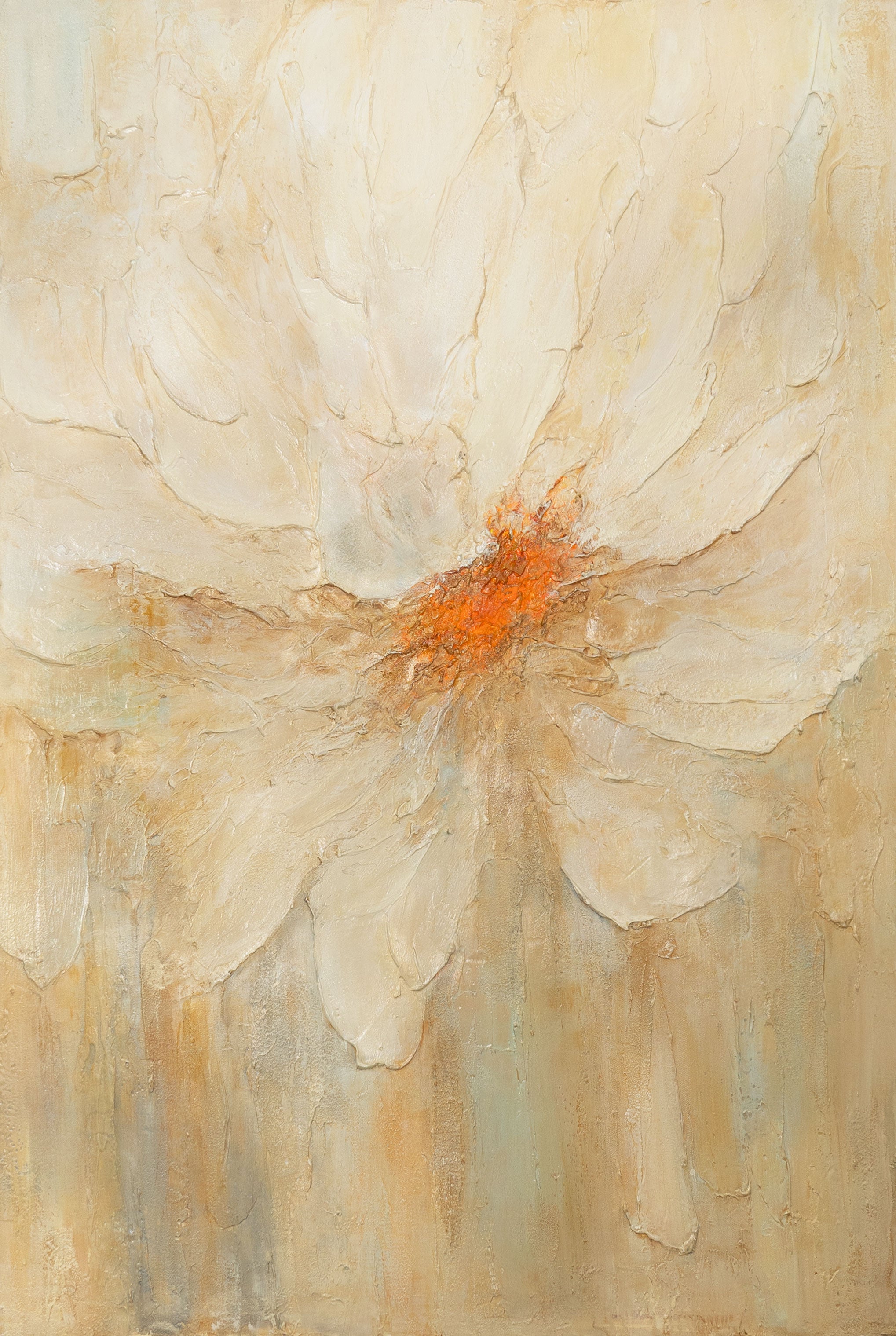 Akrylmaleriet "Ildstøv" stråler i en fascinerende komposition af bløde cremetoner og et glødende orange centrum. Strukturen giver kronbladene dybde og liv, mens de varme nuancer fremkalder indtryk af lys og bevægelse.