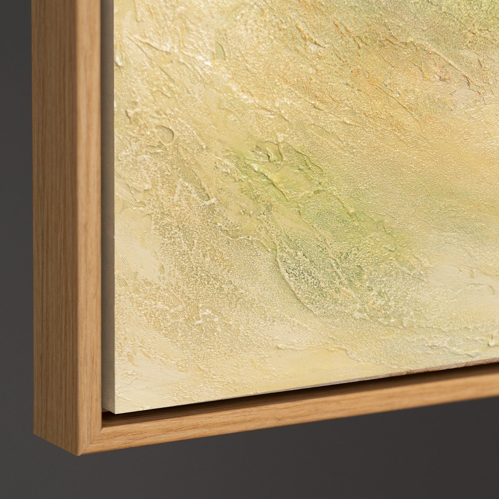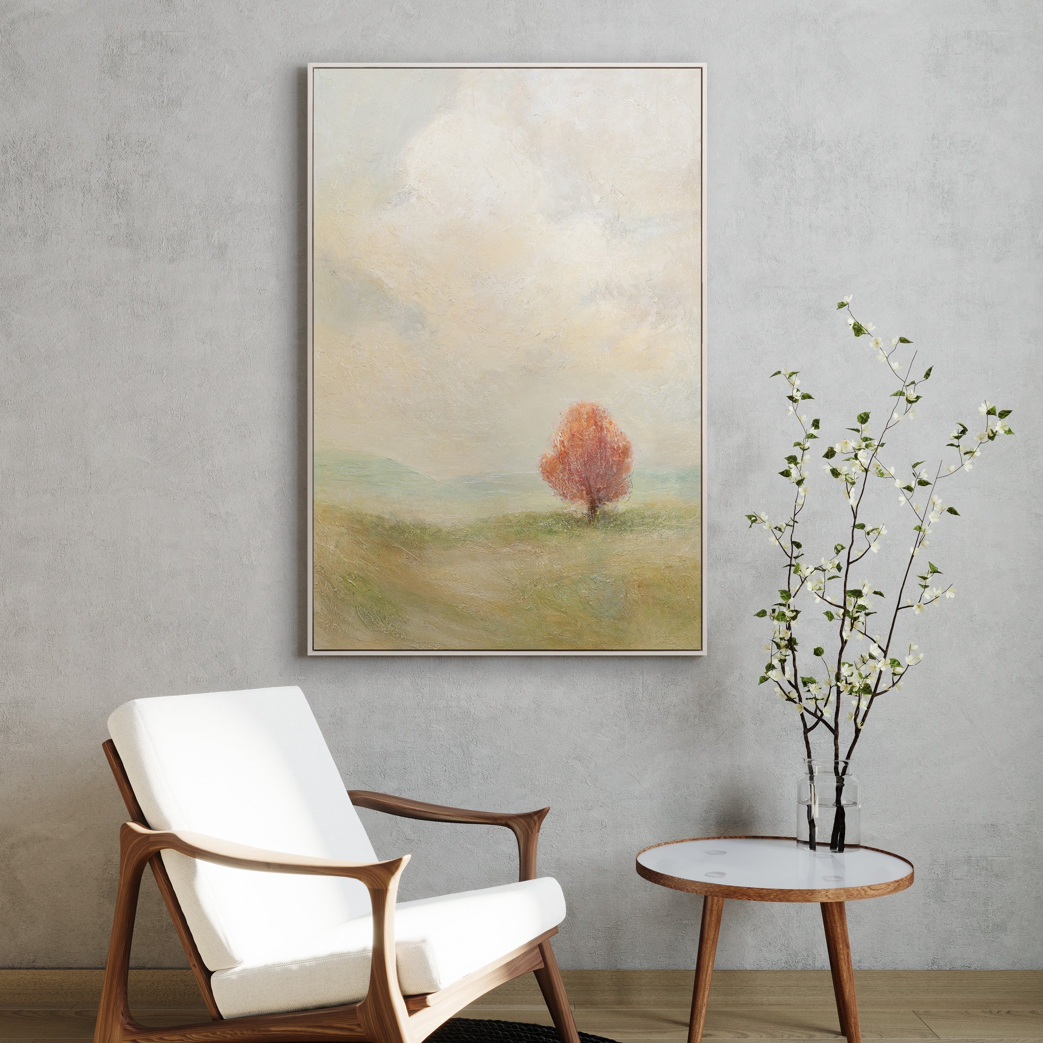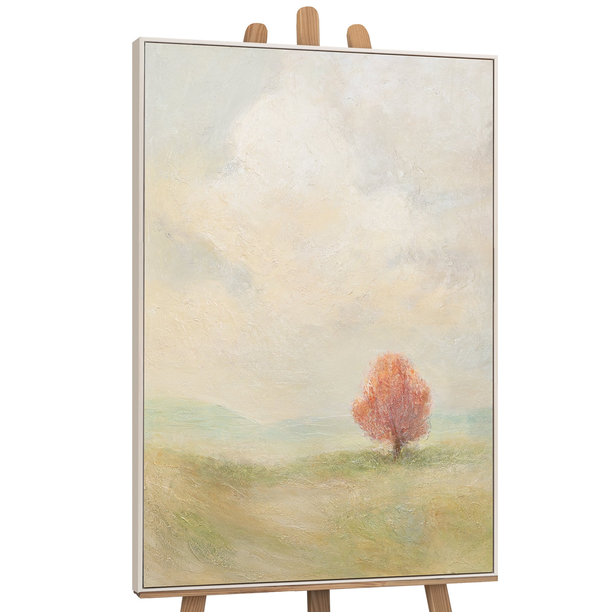 "Varme Vidder" inviterer dig ind i et stille, lysfyldt landskab, hvor et enkelt træ i blid aprikos står som centrum. De blide overgange mellem beige, grøn og creme skaber en følelse af ro og tryghed, mens den fine struktur på lærredet giver maleriet liv.