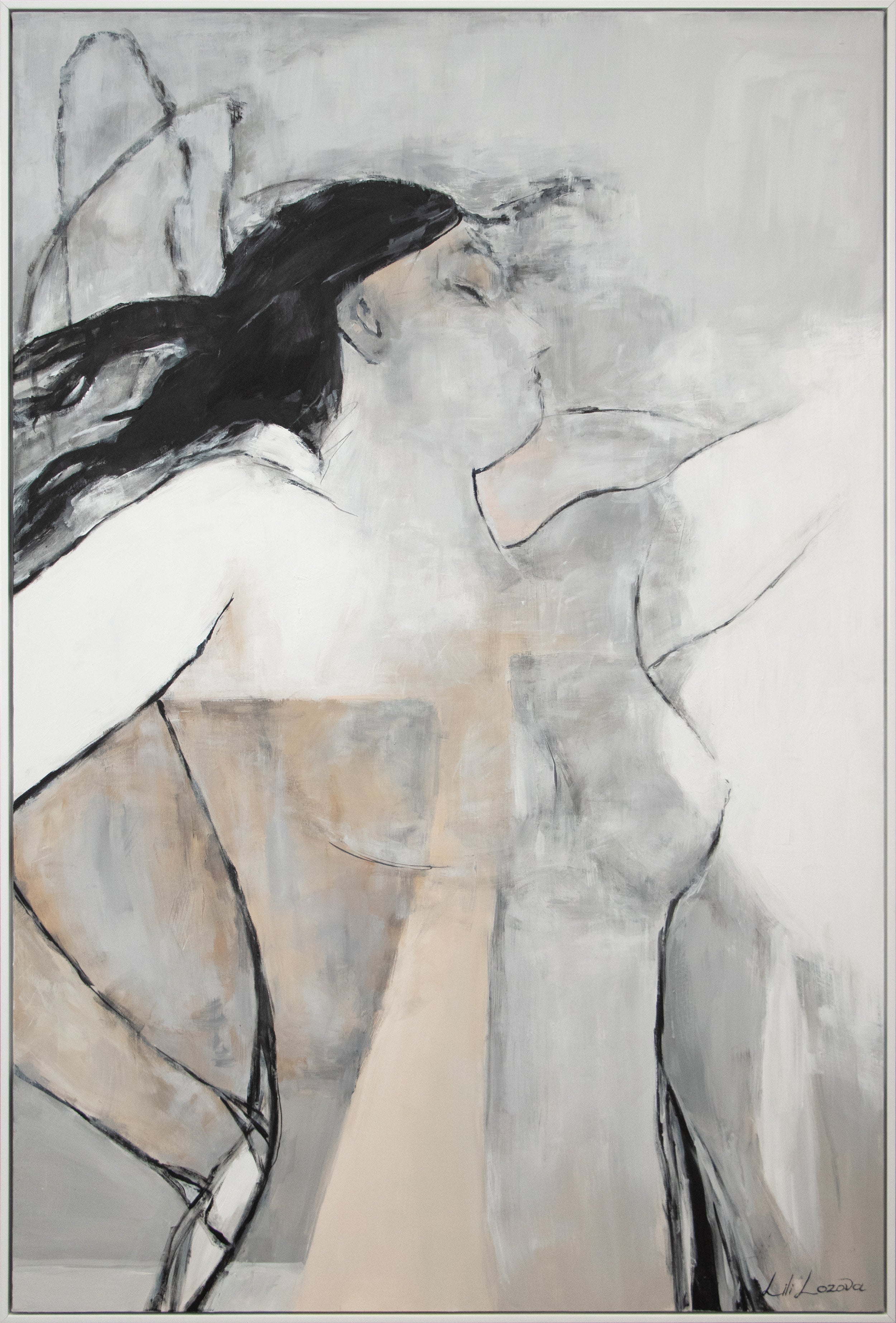Det håndmalede maleri „Mechelen“ præsenterer en feminin silhuet i en reduceret farvepalette af grå, beige og sort. De bløde linjer og abstrakte former understreger en stille elegance og ro, mens den minimalistiske udførelse fokuserer opmærksomheden på posen og udtrykket. Den matte tekstur og de reducerede konturer giver kunstværket en afdæmpet, moderne karakter, der passer perfekt til et minimalistisk eller skandinavisk interiør.