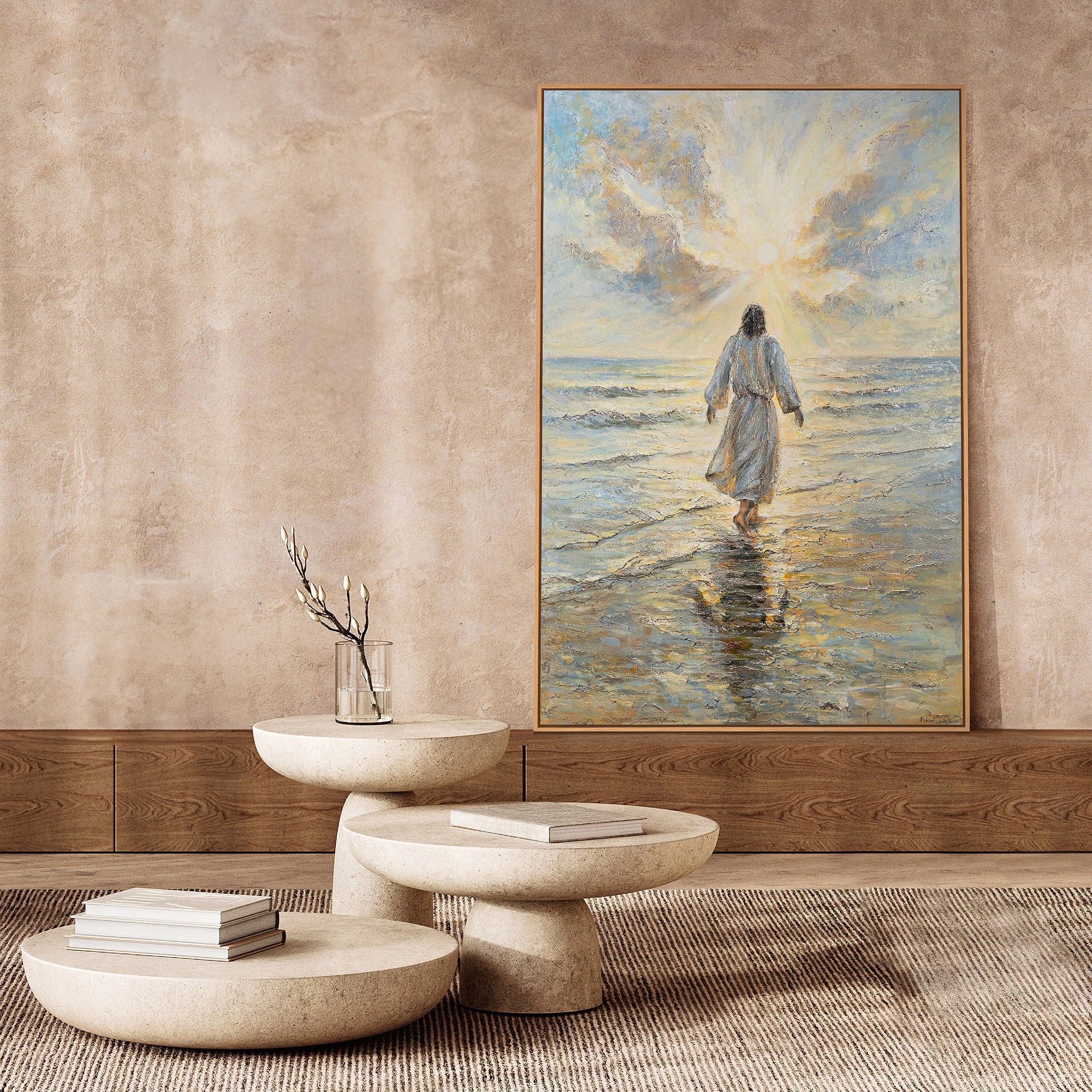 „Vejen til Lyset“ viser en kraftfuld religiøs scene – Jesus, der går på vandet, omgivet af strålende lys og de blide farver af himlen. Fremstillingen af Kristus ved havet symboliserer lyset af håb og den guddommelige tilstedeværelse. Dette mesterværk vækker en følelse af fred og spirituel oplysning og passer perfekt ind i ethvert kristent hjem. En ideel tilføjelse for dem, der søger kunst på lærred med religiøs og spirituel betydning.