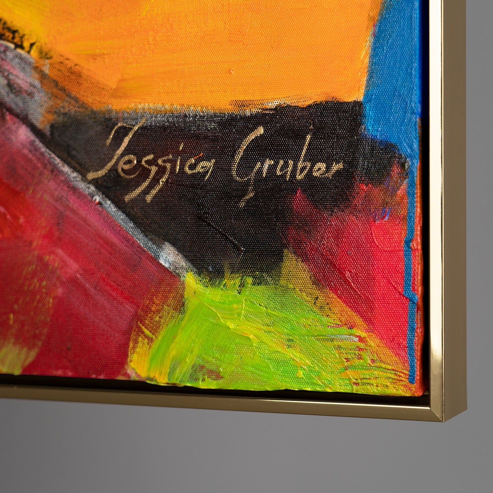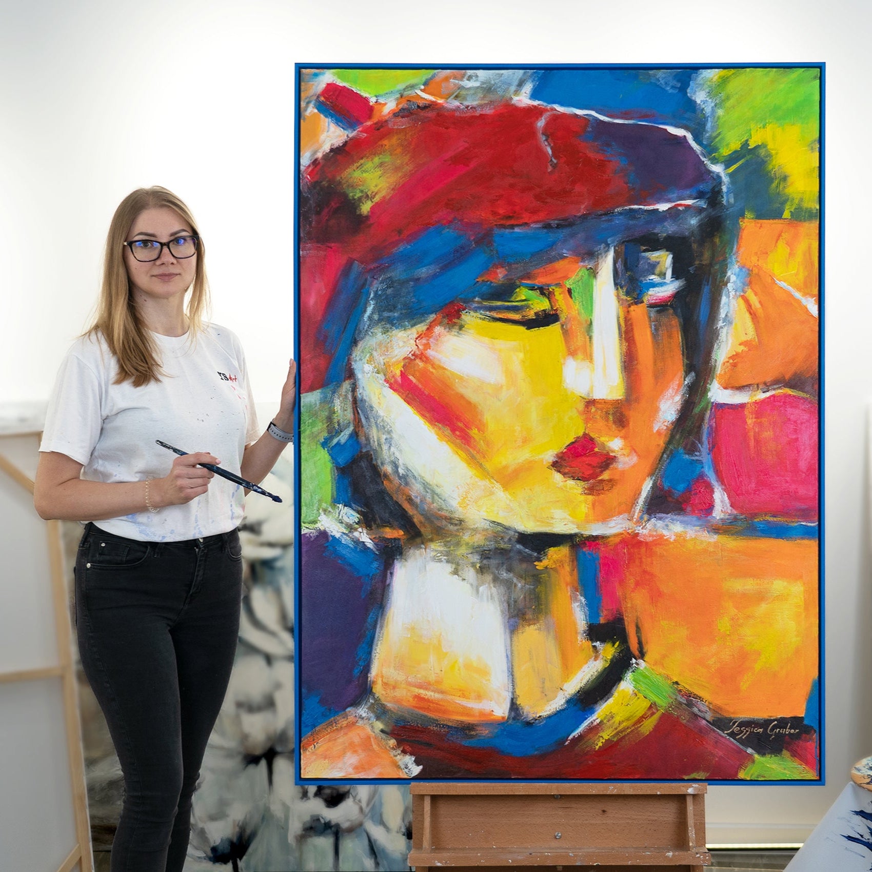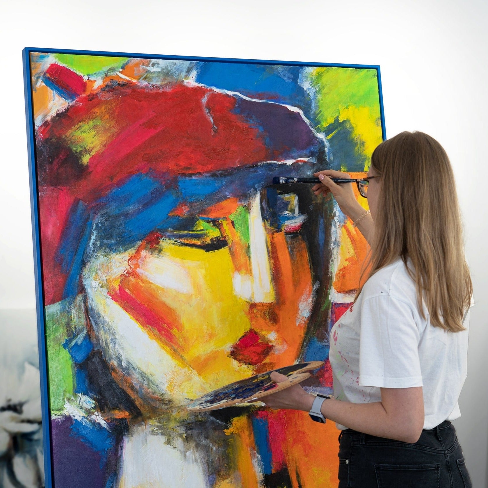 Berig dit hjem med dette farverige, abstrakte kunstværk, der forestiller et livligt og farverigt portræt. Maleriet imponerer med kraftige farvetoner og dynamiske penselstrøg. Det er 100 % håndmalet og fremhæves af en elegant ramme.