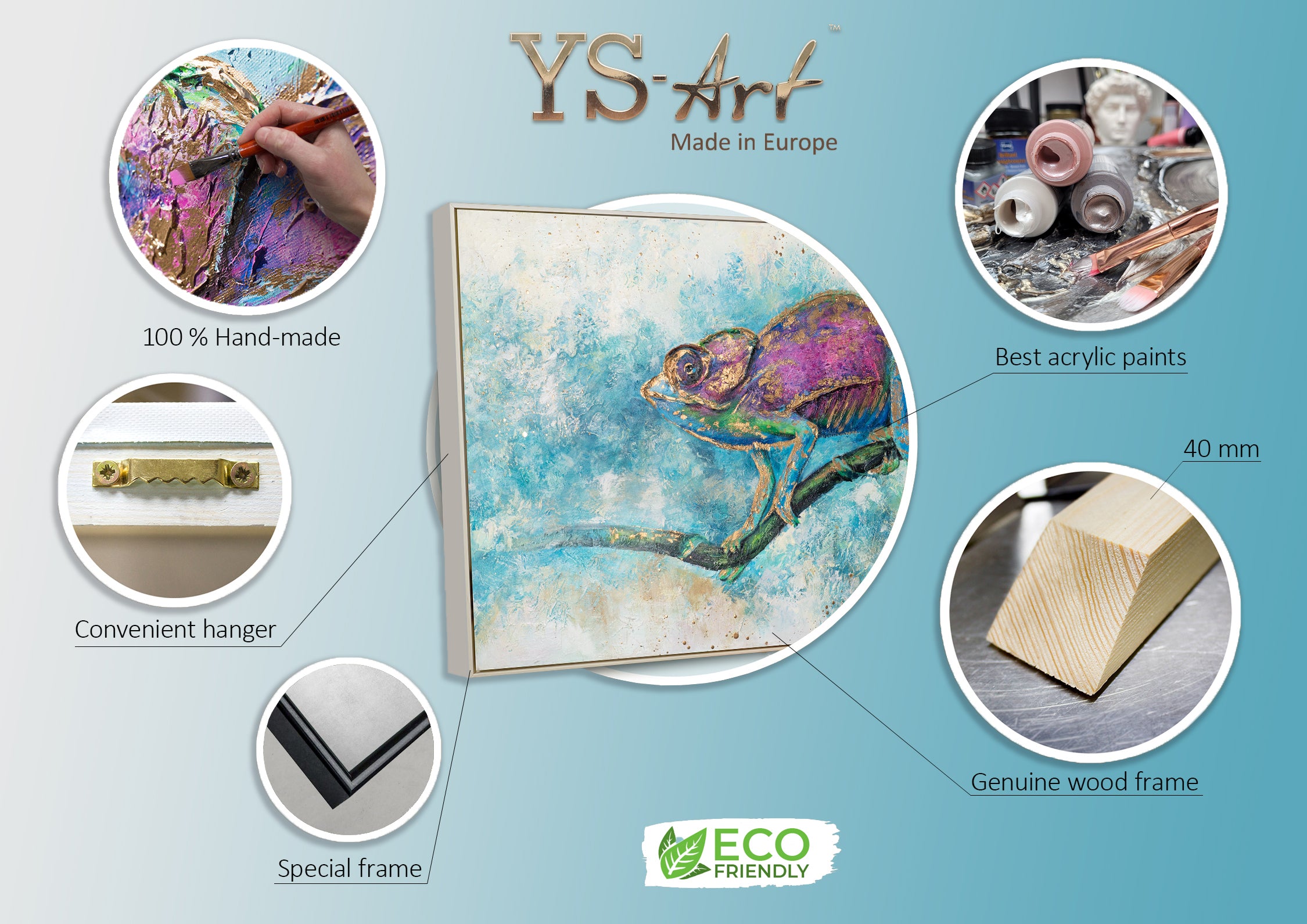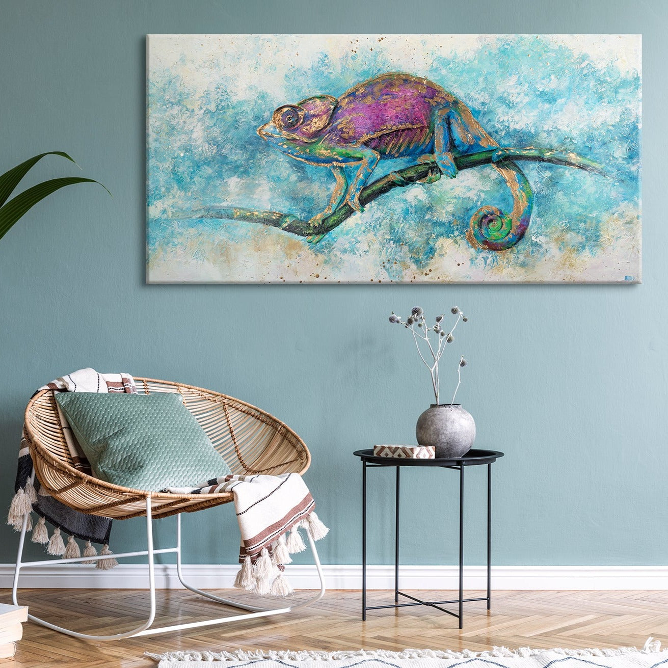 Berig din samling med dette fascinerende, håndmalede leguan maleri. Dette moderne kunstværk viser en kamæleon på en gren, omgivet af en baggrund i blå og grønne nuancer. Anvendelsen af akrylfarver giver billedet dybde og tekstur, hvilket gør det til et blikfang i ethvert rum. Det er 100% håndlavet og fremhæves af en elegant ramme.