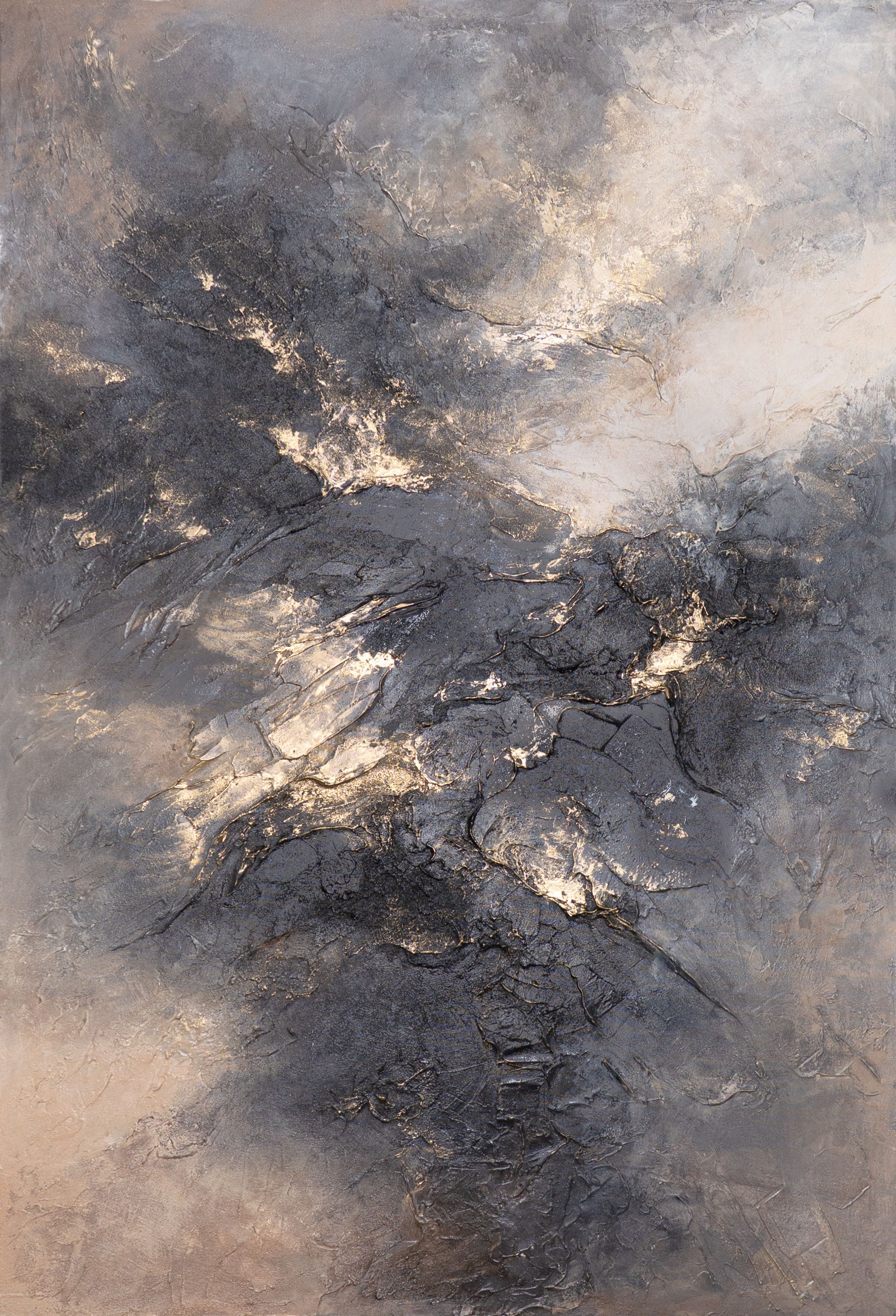 Giv dit hjem en kraftfuld udstråling med det håndmalede lærredsbillede "Himmelglød". Mørke gråtoner smelter sammen med bløde beige nuancer, mens gyldne accenter bryder frem som lysstråler gennem skyerne. Den strukturmaling giver værket fascinerende dybde og dynamik, som gør hvert maleri unikt.