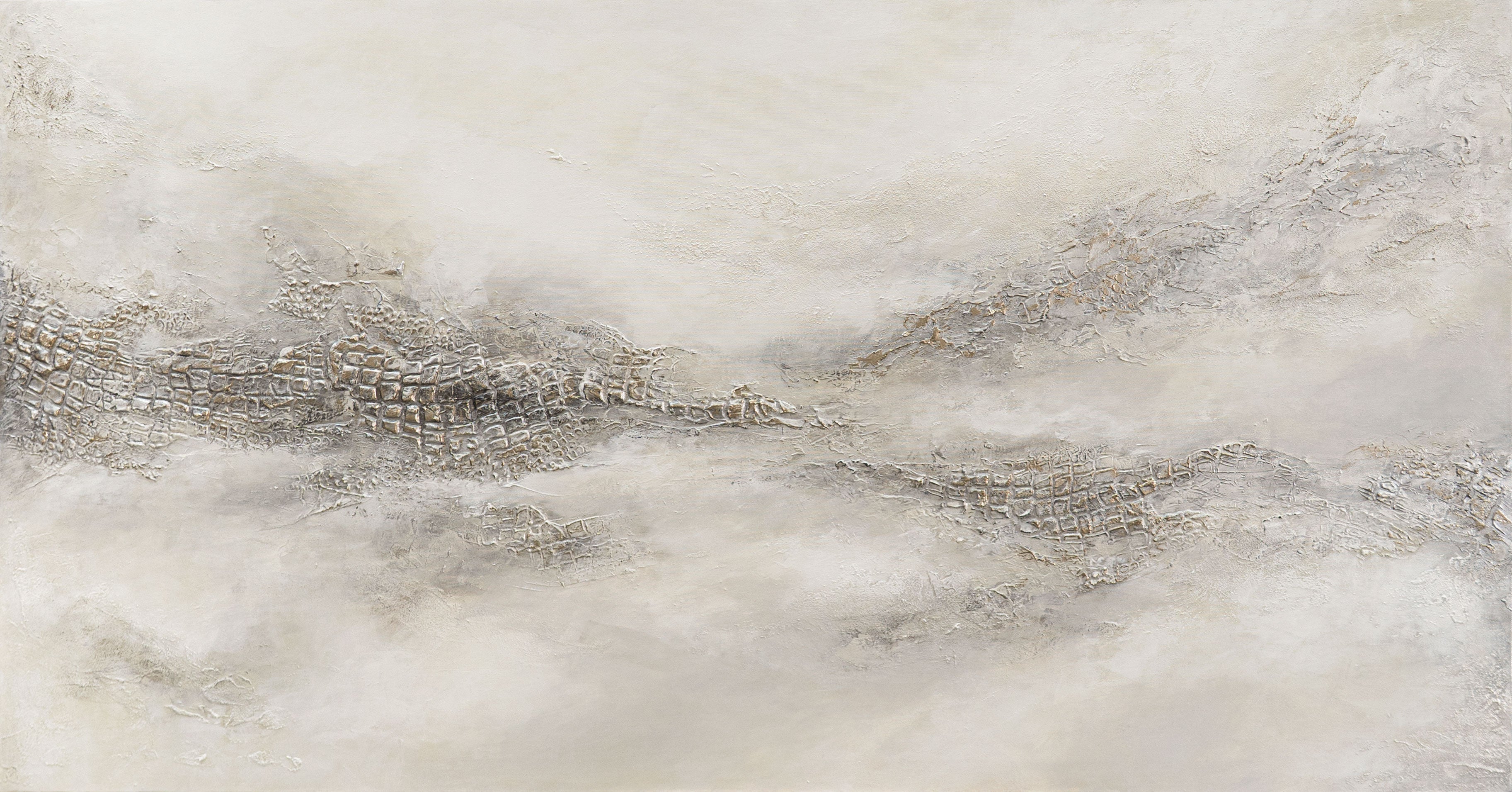 „Tåget Fjernhed“ udfolder den stille skønhed af det ukendte. I blide gråtoner og delikate beige nuancer smelter strukturer sammen til en tåget vidde, der svæver mellem drøm og erindring. Den ophøjede struktur giver overfladen dybde, mens lyset glider hen over de relieflignende flader – som en fjern horisont, der forsvinder i dis.
