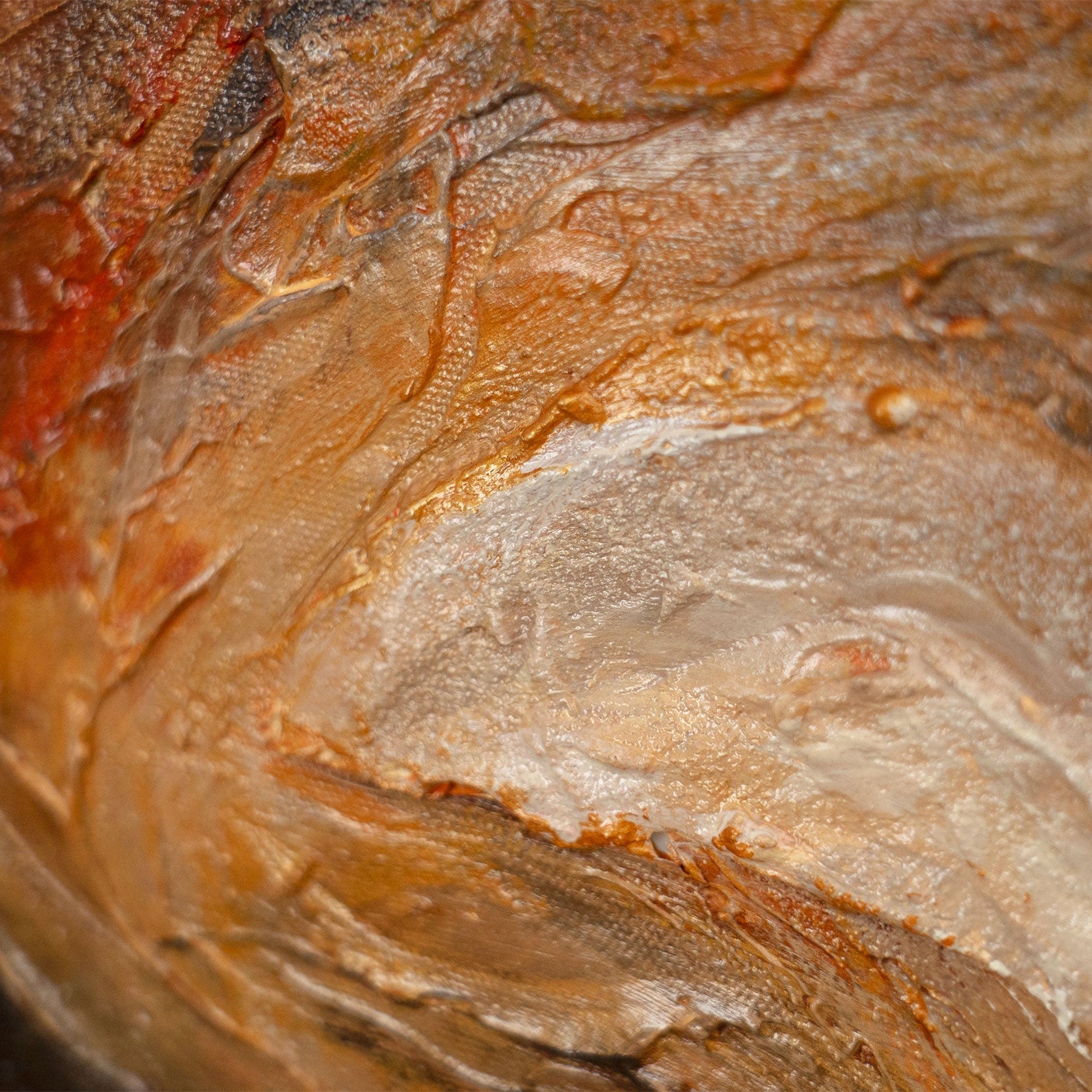 "Lightning of Eternity" er et kraftfuldt abstrakt akrylmaleri, der er karakteriseret ved dynamiske, flydende former og intens lagdeling. Varme brune, okker og grå farver kombineres med dybe kontraster for at skabe en energisk komposition, der minder om geologiske bevægelser og naturlige spændinger. Den teksturerede overflade forstærker dybden og den håndmalede karakter af dette værk.