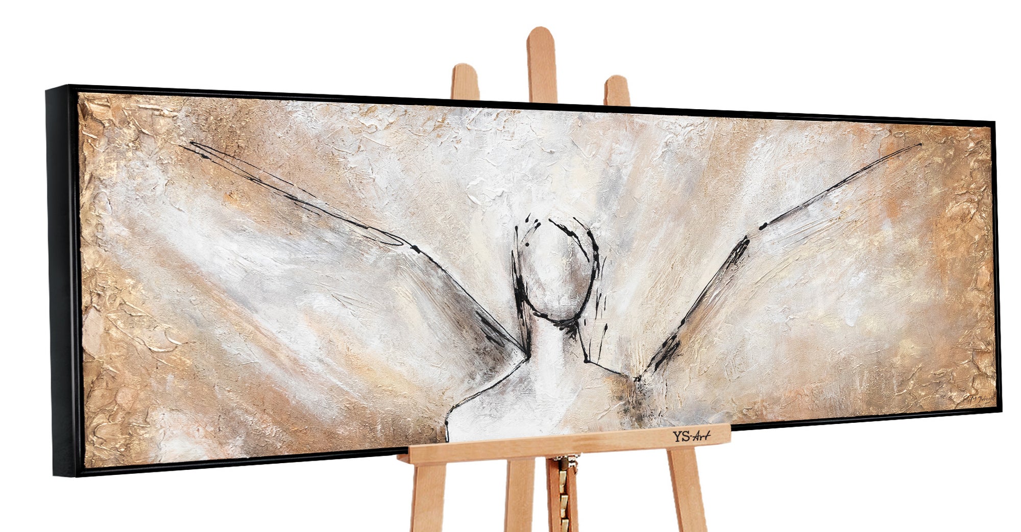 Dette håndmalede abstrakt maleri forestiller en minimalistisk engel og skaber en særlig atmosfære i hjemmet. De bløde beige-, guld- og hvide nuancer giver værket et elegant udtryk, mens den enkle figurform formidler symbolik og ro. Ideel til moderne kunst til stuen, hvor du ønsker både æstetik og harmoni.