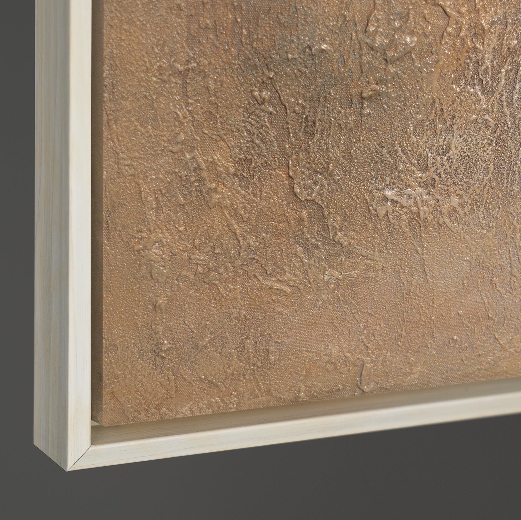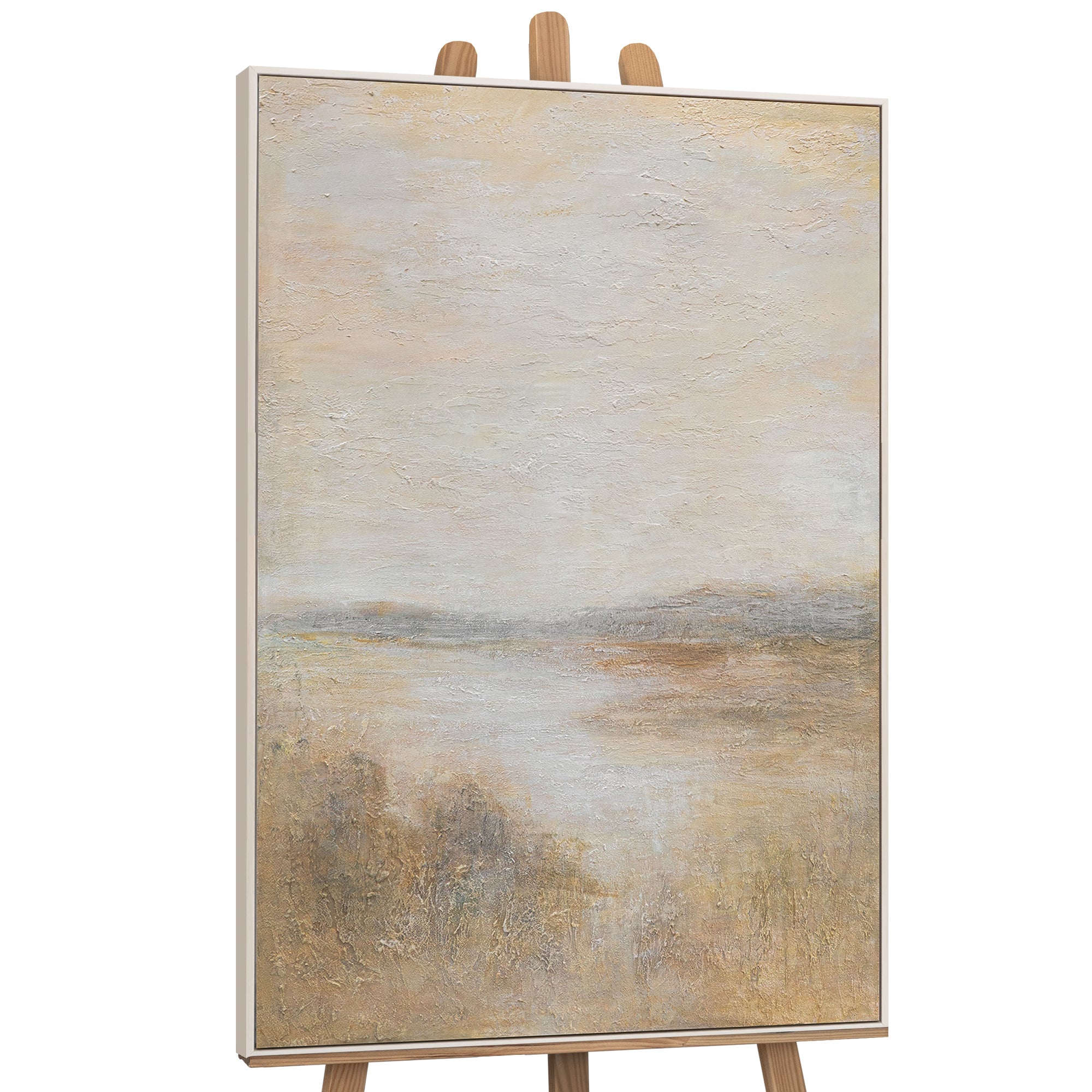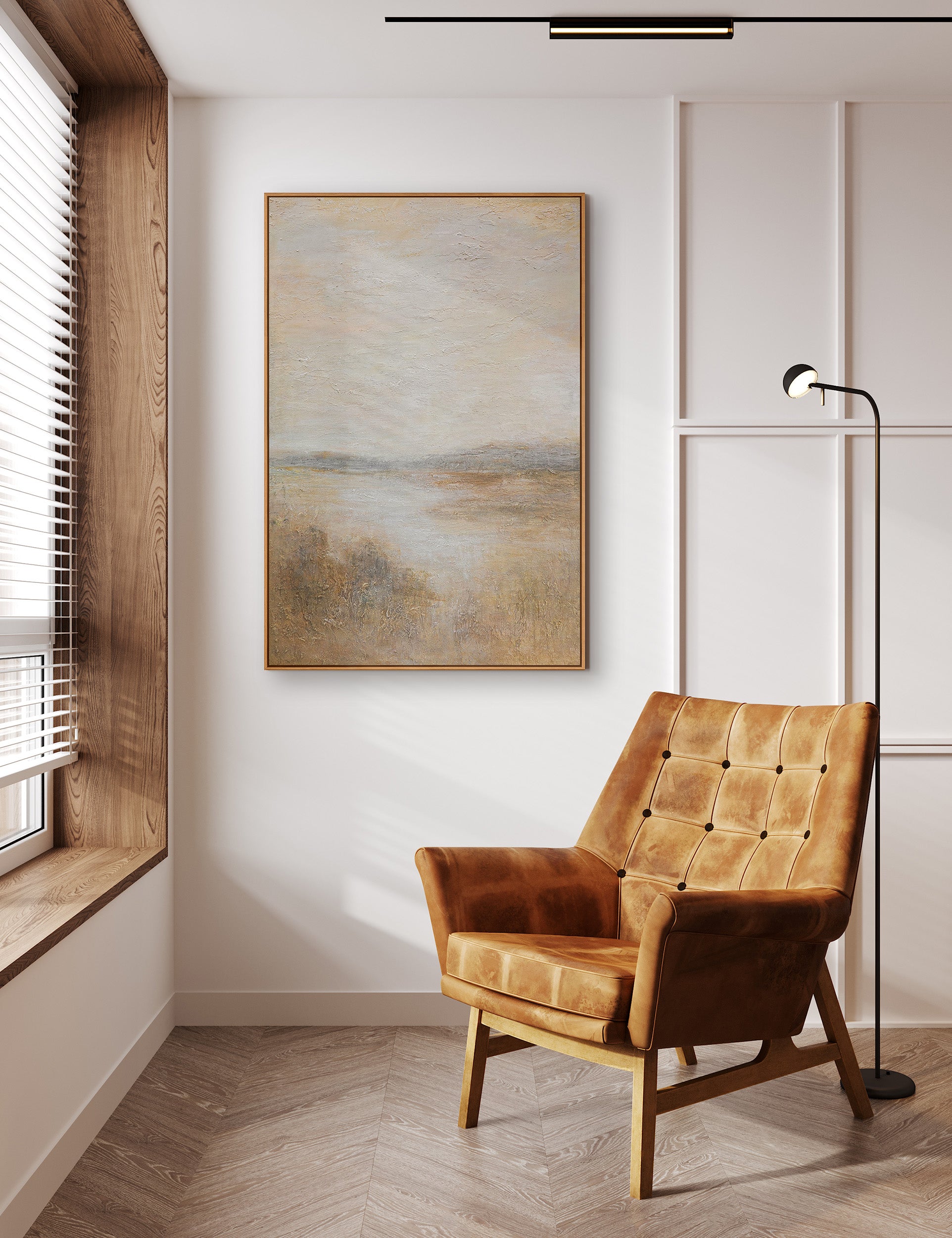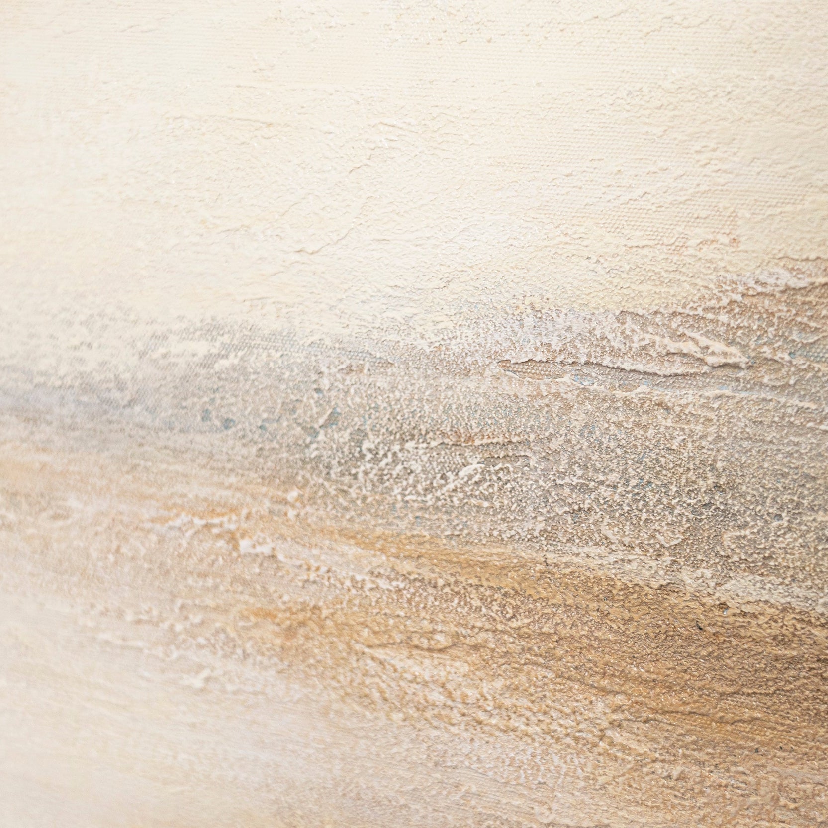 "Tåget morgen" indfanger den stille poesi i en gryende dag. I bløde beigenuancer, fine gråtoner og lette lysreflekser opstår et atmosfærisk landskab, der formidler både ro og dybde. Den strukturerede overflade giver værket en sanselig taktilitet – som tåge, der glider hen over en stille slette.