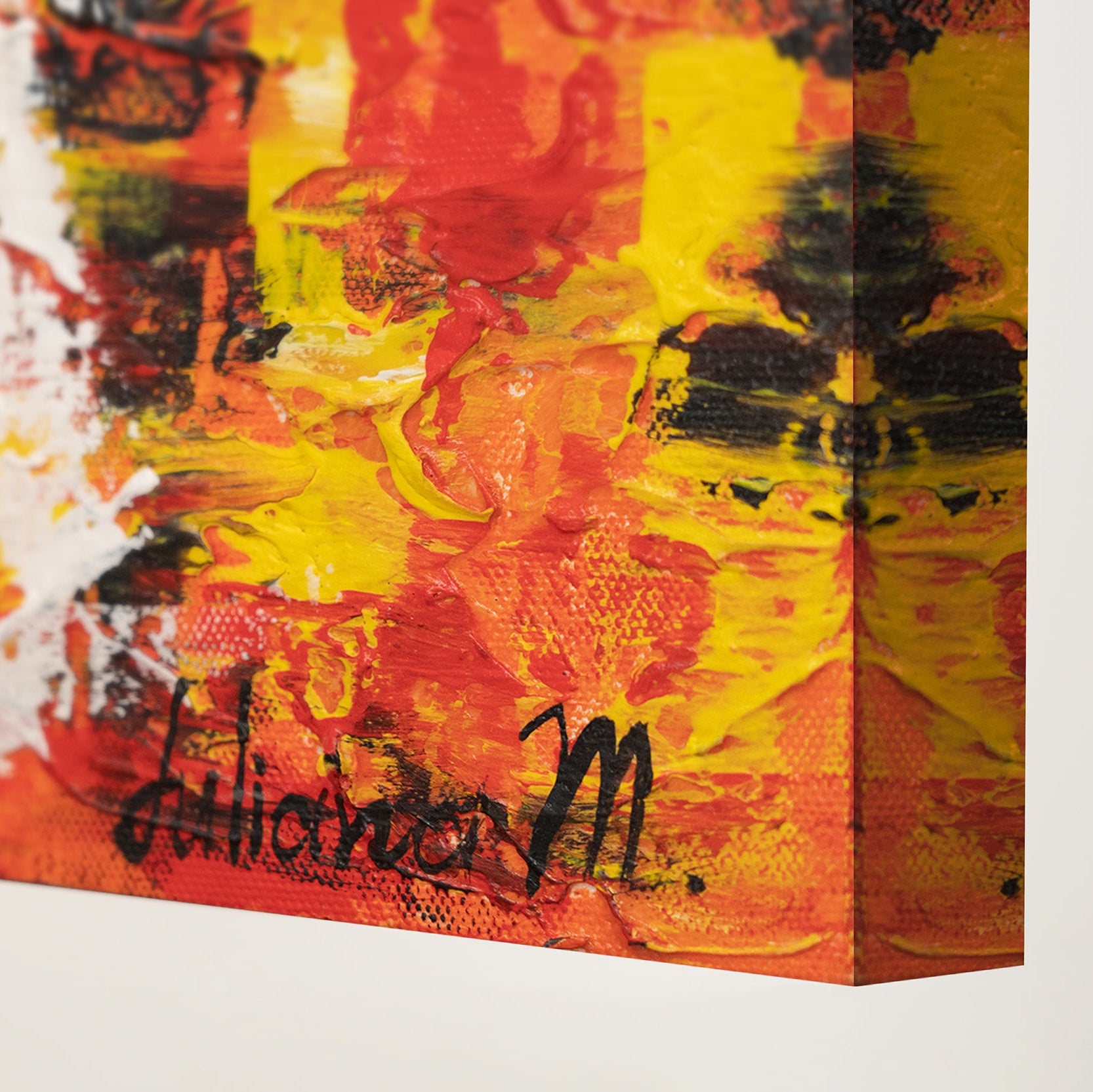 Berig dit hjem med dette farverige, abstrakte kunstværk, der viser både i en malerisk solnedgang. Billedet imponerer med levende farver og udtryksfulde penselstrøg i akrylfarve. Det er 100% håndmalet og fremhæves af en passende ramme.