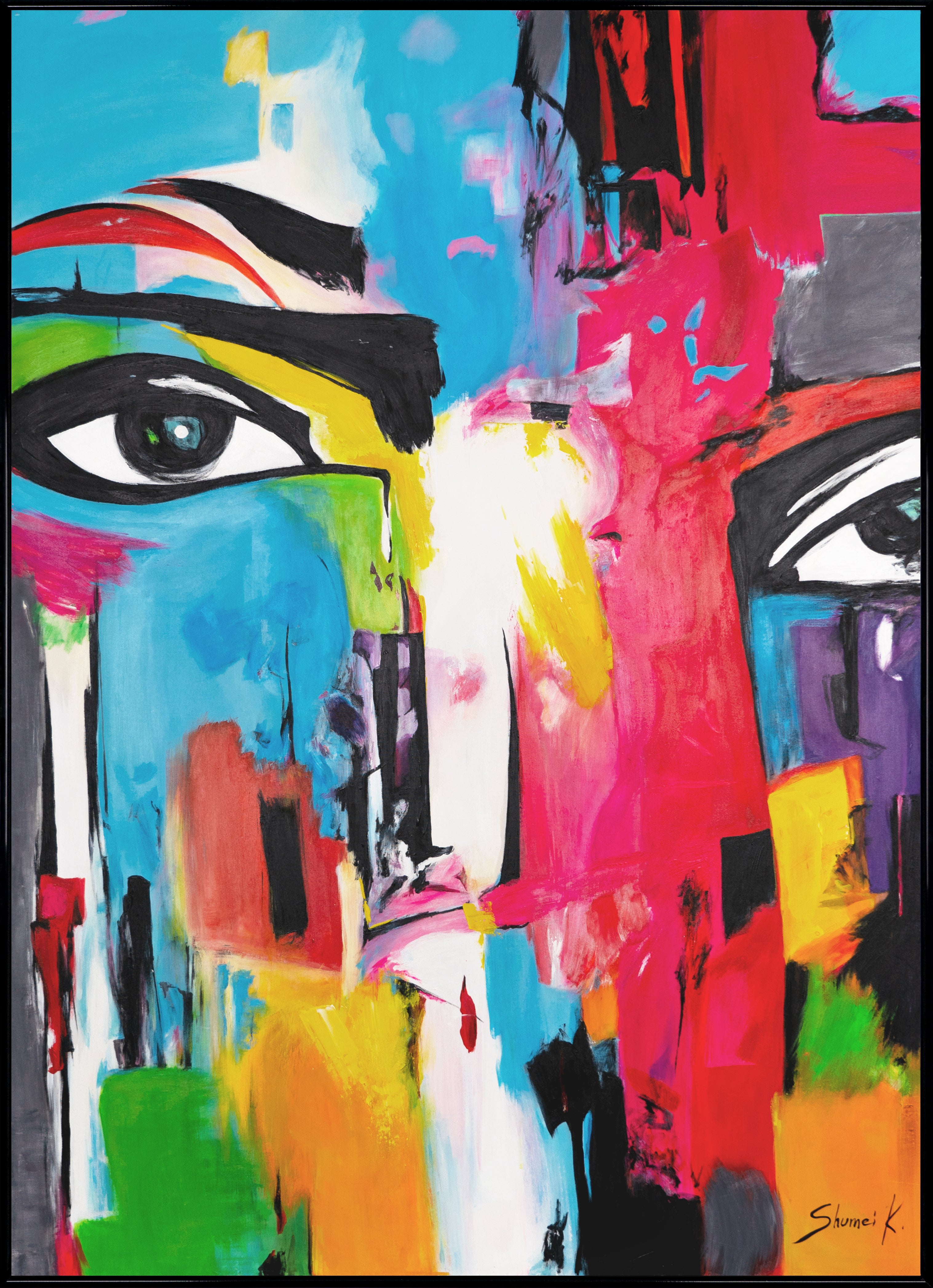 Et udtryksfuldt lærredsmaleri, der kombinerer farverige følelser med moderne abstraktion: "Glaseret Betragtning" viser et fragmenteret ansigt i strålende rød, blå, pink og gul, gennemskåret af sorte kontraster. Strukturen i akrylfarverne giver en mærkbar dybde og gør kompositionen til et intenst blikfang med urbant præg.