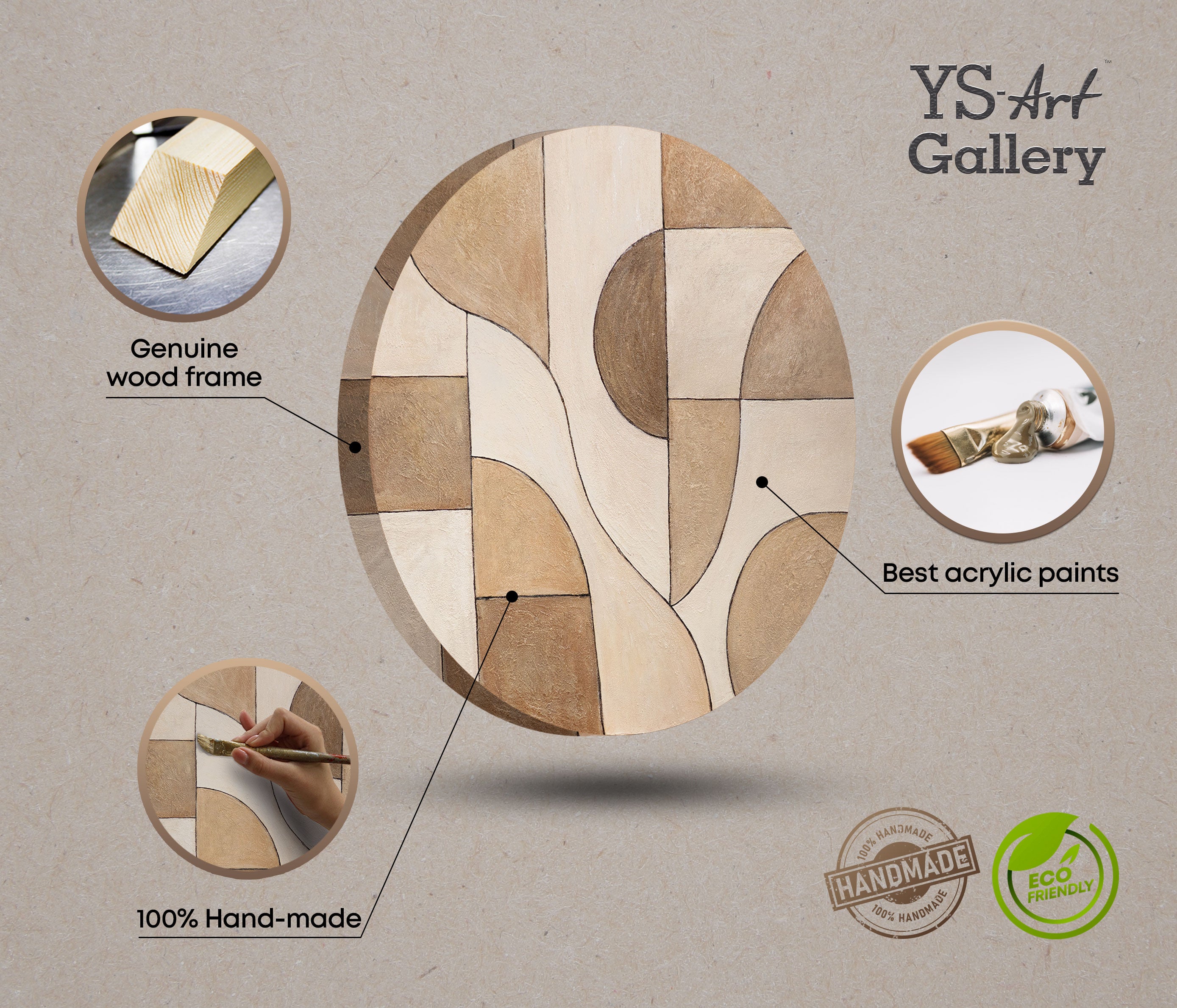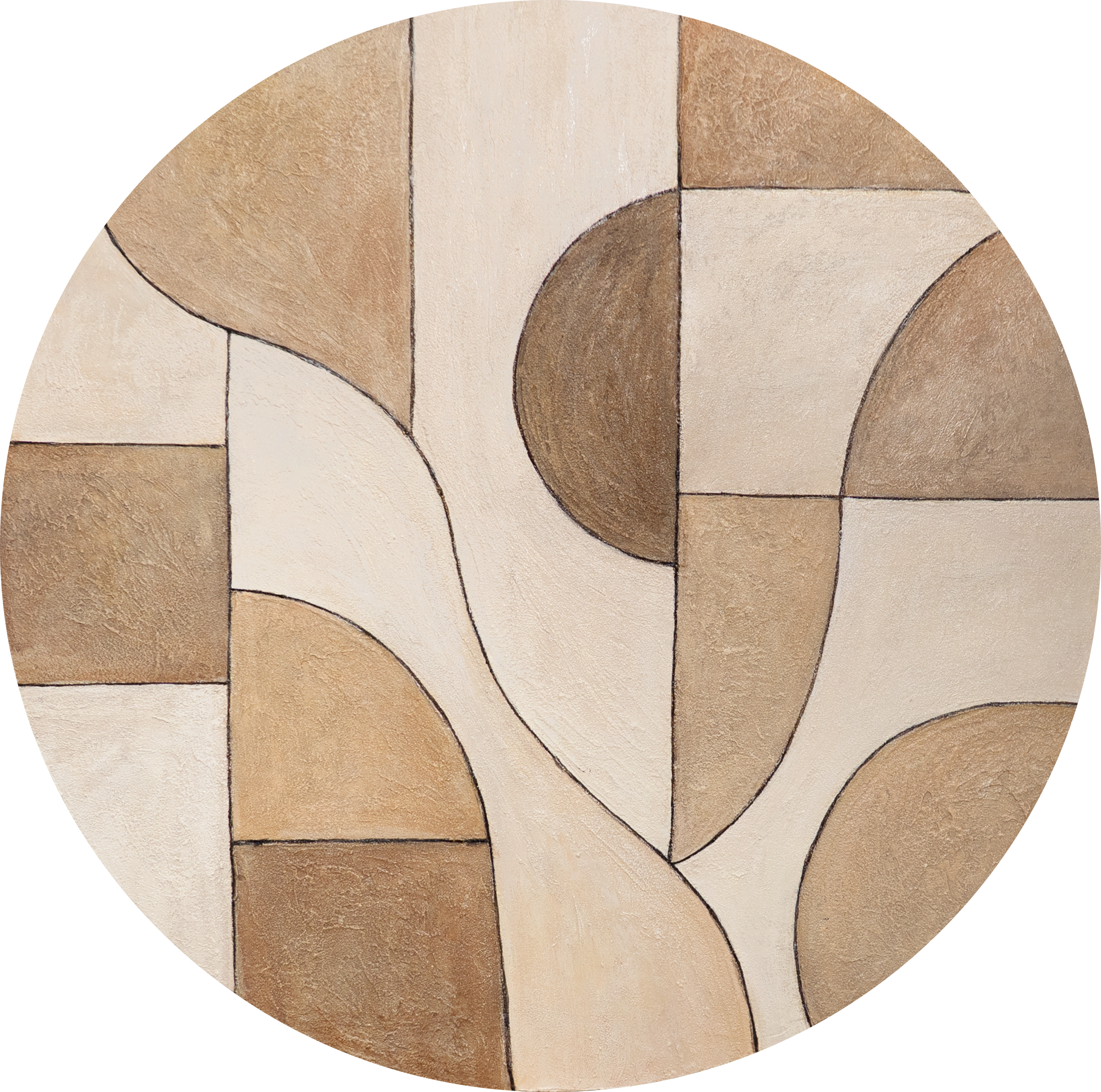 „Tidens Ornamenter“ repræsenterer rytmen af former og den stille bevægelse af årene. Bløde buede linjer møder klare geometriske flader – en dialog mellem orden og flow. De jordnære beige og brune nuancer giver kompositionen varme, dybde og naturlig ro.