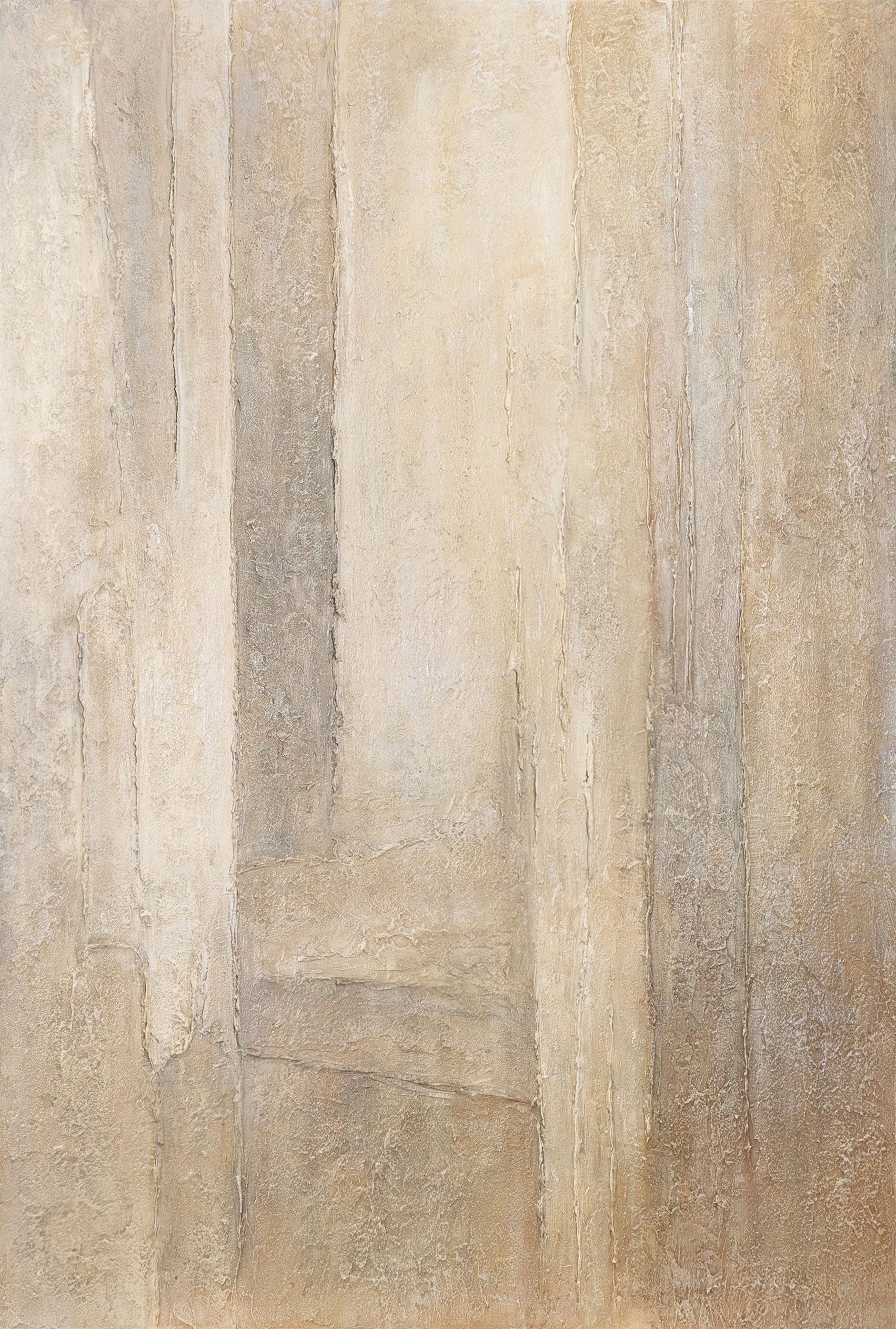 Dette håndmalede akrylmaleri imponerer med sin rolige, vertikale komposition og den harmoniske farvepalet i beige, sand og bløde gråtoner. Den reliefagtige struktur tilfører værket dybde og naturlighed og inviterer til kontemplativ fordybelse.